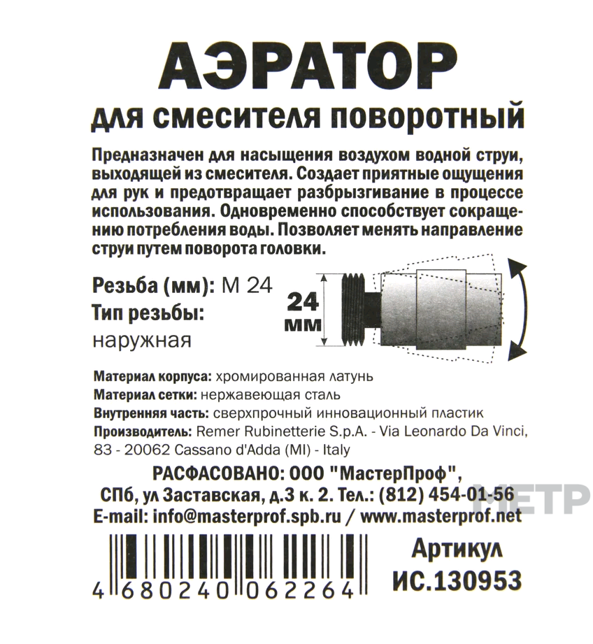 Аэратор на шарнире MPF М24 наруж. резьба предназначен для насыщения воздухом водной струи, выходящей из смесителя. Создает приятные ощущения для рук и предотвращает разбрызгивание в процессе использования. Одновременно способствует сокращению потребления воды. Позволяет менять направление струи путем поворота головки.