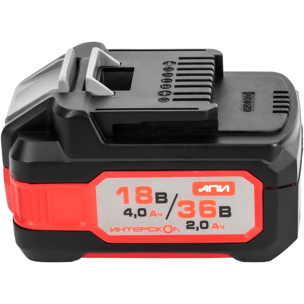 Литийионная (Li-ion) аккумуляторная батарея слайдерного типа единой универсальной платформы АПИ 18/36 В емкостью 4,0/2,0 А∙ч совместима с продукцией ИНТЕРСКОЛ, рассчитанной на номинальные напряжения питания как 18 В, так и 36 В, с запатентованным стандартным разъемом АПИ. Переключение происходит автоматически в зависимости от присоединенного устройства, полностью исключая вероятность ошибки пользователя. Внутри установлены качественные и надежные высокотоковые аккумуляторы типа 18650, что позволяет вывести возможности беспроводного инструмента на уровень сетевых аналогов мощностью до 2000 Вт, значительно повышая потенциал его профессионального применения.