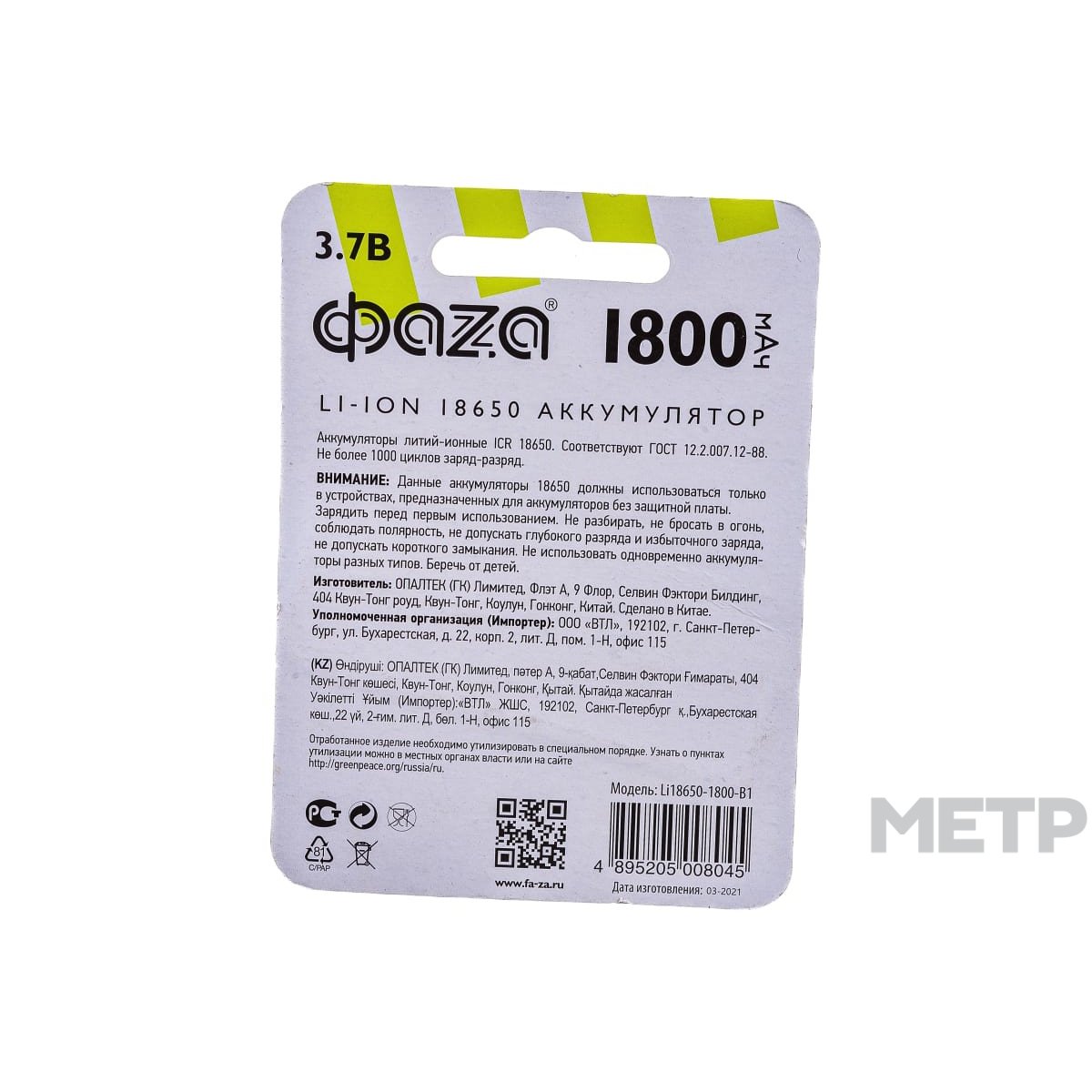 Аккумулятор Li-ION ФАZА 18650 1800 мАч 1 шт. используется в устройствах, где необходима большая емкость аккумулятора (фонари с мощными светодиодами, внешние аккумуляторные источники питания, электронные сигареты, батареи ноутбуков, аккумуляторы транспортных средств и т.д.). Разрешено устанавливать в устройства, позволяющие применять аккумуляторы данного типа без защиты.