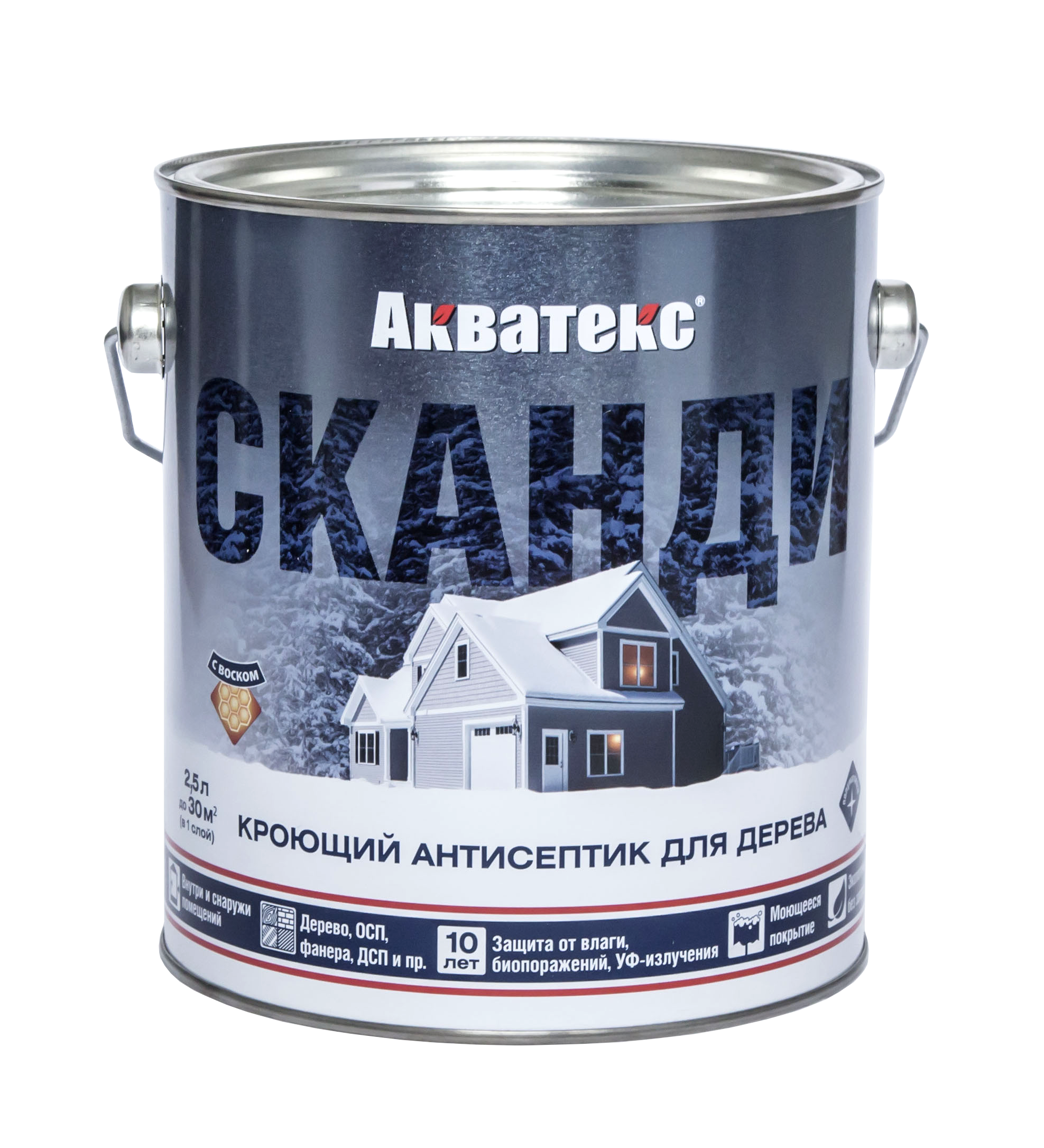 Кроющий антисептик Акватекс Сканди северное море 2,5 л предназначен для: декоративной обработки древесины с целью получения плотного кроющего покрытия, скрывающего рисунок, но сохраняющего видимой структуру древесины, защиты древесины от воздействия влаги, появления и распространения биопоражений (гниения, плесени, грибка, синевы), УФ-излучения (потемнения, выгорания) и других атмосферных воздействий, обновления деревянных поверхностей, ранее окрашенных алкидными или акриловыми составами, в том числе темных тонов.