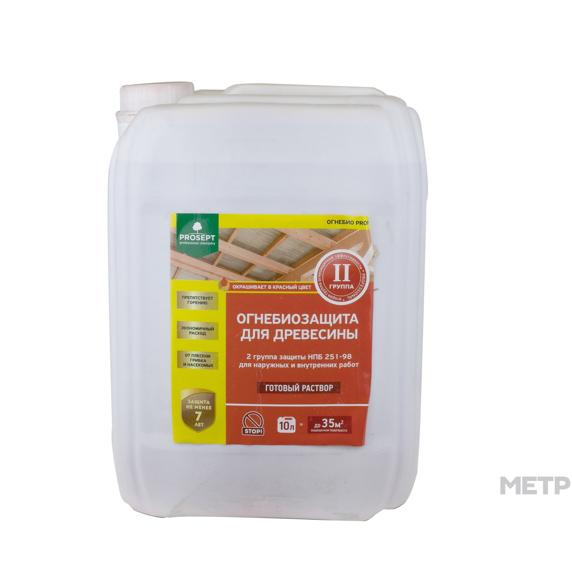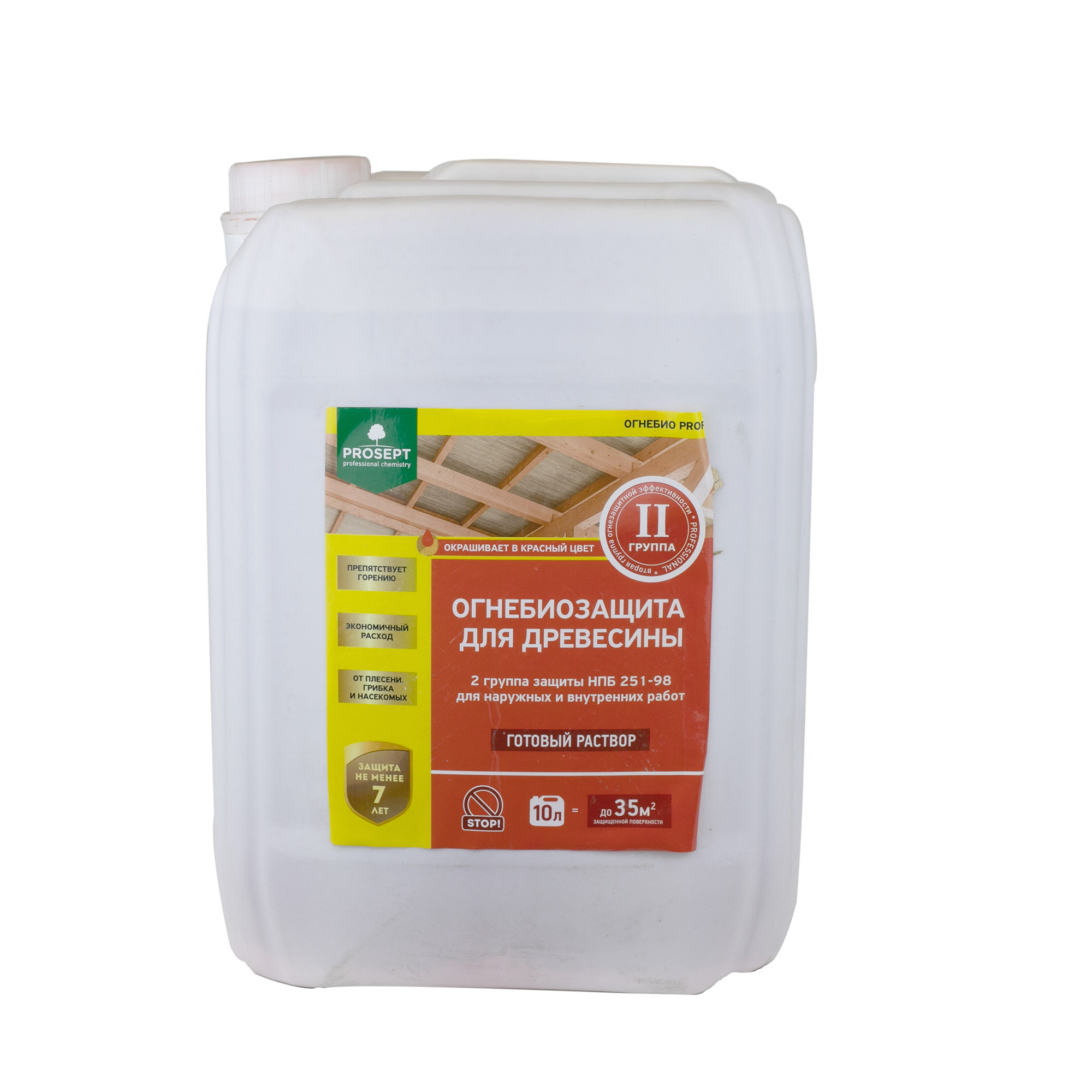 Огнебио Prof Prosept 2я группа красно-коричневый, 10 л - комплексная огнебиозащитная пропитка для древесины, используемой внутри помещений и на открытом воздухе без прямого воздействия атмосферных осадков и контакта с грунтом. Пропитка защищает от возникновения и распространения огня, а также от воздействия насекомых и грибков. Переводит древесину в трудновоспламеняемый материал. Подходит для обработки как новых конструкций, так и ранее обработанных огнезащитными составами. Пропитка устойчива к старению, не высаливается и не выщелачивается. Не оказывает негативного воздействия на свойства древесины, не изменяет ее структуру, не препятствует дальнейшей обработке, склеиванию и окраске любыми ЛКМ.
