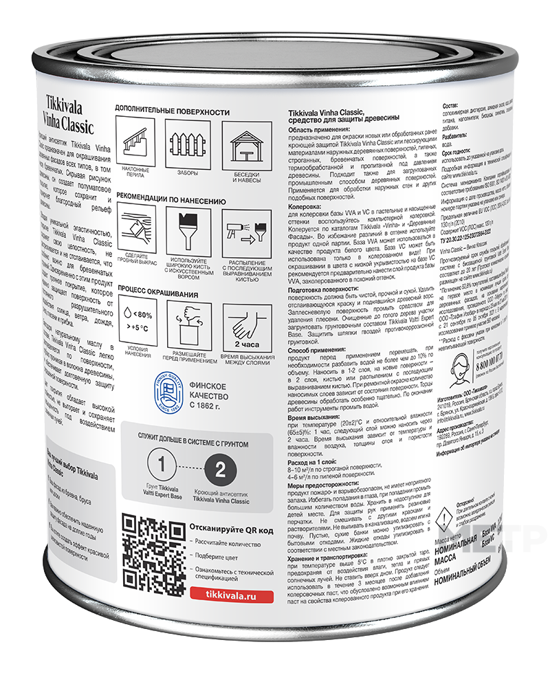 Кроющая защита Vinha CLASSIC основа VC, 0,9 л для наружных деревянных поверхностей. Готовое покрытие Tikkurila Vinha CLASSICустойчиво к атмосферным и механическим воздействиям. Оно обладает водоотталкивающей способностью, долгие годы защищая дом от непогоды. Специальные компоненты в составе кроющего антисептика Tikkurila Vinha CLASSIC уберегут дерево от синевы и плесени. Tikkurila Vinha CLASSIC обладает великолепной укрывистостью. Это позволяет использовать его, чтобы перекрашивать старые фасады, покрытые антисептиками темных тонов, в светлые оттенки (и наоборот).