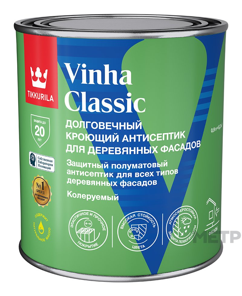 Кроющая защита Vinha CLASSIC основа VVA, 0,9 л для наружных деревянных поверхностей. Готовое покрытие Tikkurila Vinha CLASSIC устойчиво к атмосферным и механическим воздействиям. Оно обладает водоотталкивающей способностью, долгие годы защищая дом от непогоды. Специальные компоненты в составе кроющего антисептика Tikkurila Vinha CLASSIC уберегут дерево от синевы и плесени. Tikkurila Vinha CLASSIC обладает великолепной укрывистостью. Это позволяет использовать его, чтобы перекрашивать старые фасады, покрытые антисептиками темных тонов, в светлые оттенки (и наоборот).