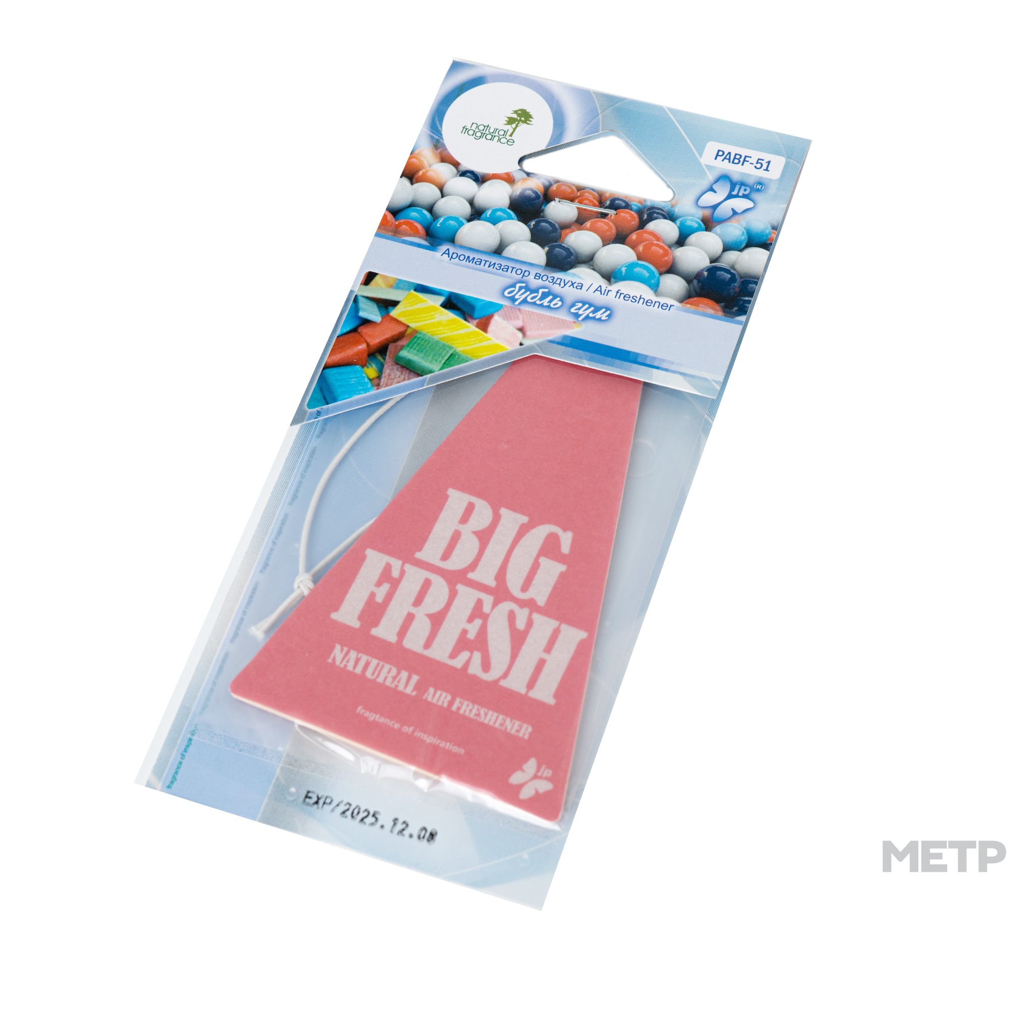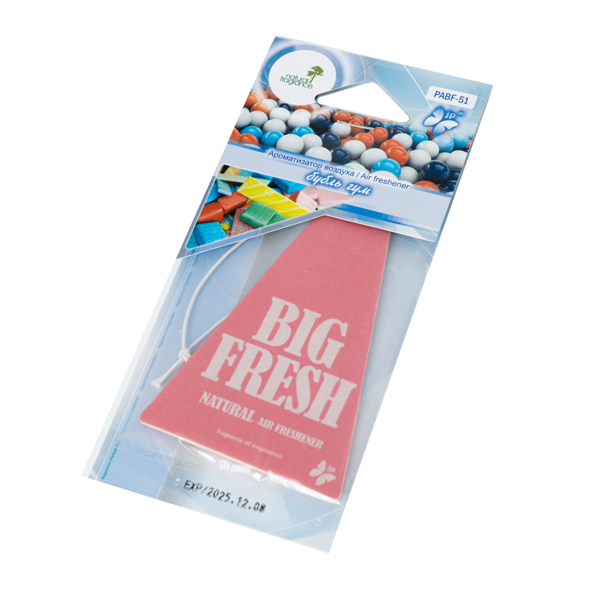 Ароматизатор BIG FRESH «Бабл Гам» подвесной представляет собой сухой картонный лист, распространяющий запахи пропитки на протяжении целого месяца. Запах популярной сладости помогает отвлекаться от насущных проблем и больше внимания уделять вождению. Невысокая цена картонных изделий позволяет чаще освежать ароматы.