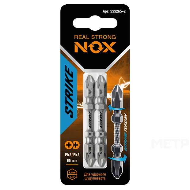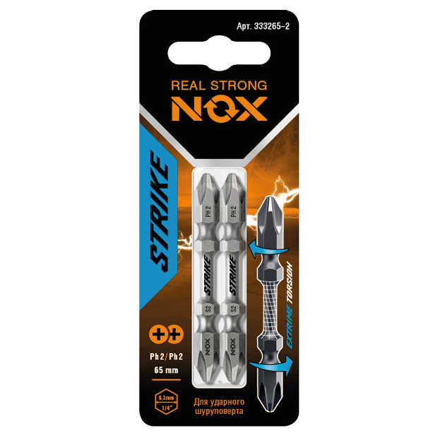 Бита двухсторонняя РH2хРH2 65мм Impact STRIKE 2шт торсионные S2 изготовлена из легированной стали, обладающей повышенной прочностью и износостойкостью. Шестигранный хвостовик ¼ HEX исключает проскальзывание оснастки в патроне электроинструмента. Биты NOX изготовлены методом фрезеровки , что обеспечивает точность формы биты в соответствии со стандартом. Подходит для работы электродрелью со стандартным трёхкулачковым зажимным патроном и шуруповёртом с шестигранным патроном для быстрой смены насадки.