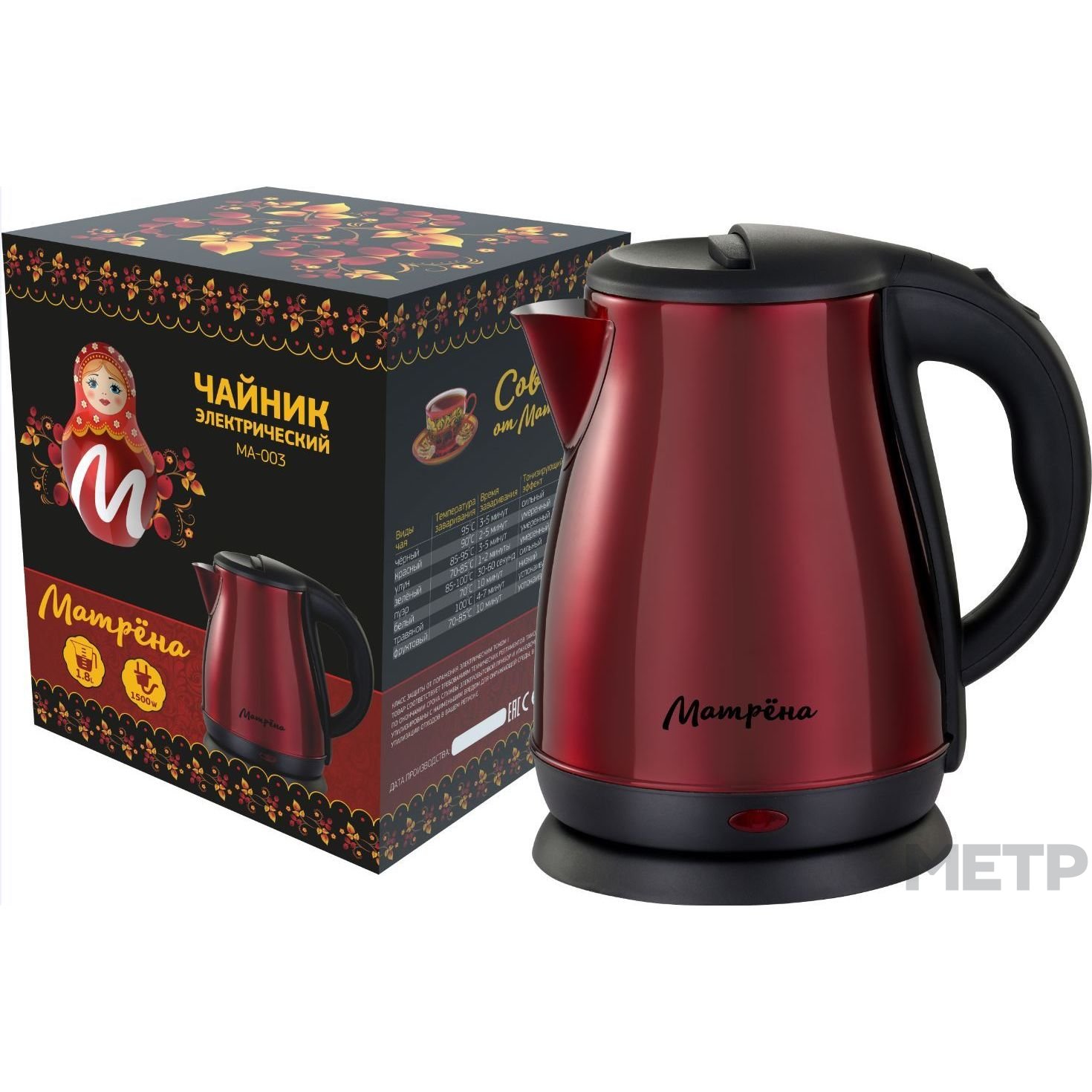 Чайник электрический из нержавеющей стали MA-003 мощностью 1500 Вт и объем 1,8 л. Корпус изготовлены из нержавеющей стали марки 18/10. Автоотключение при закипании и отсутствии воды исключает негативные последствия при эксплуатации чайника и способствует дополнительной безопасности.