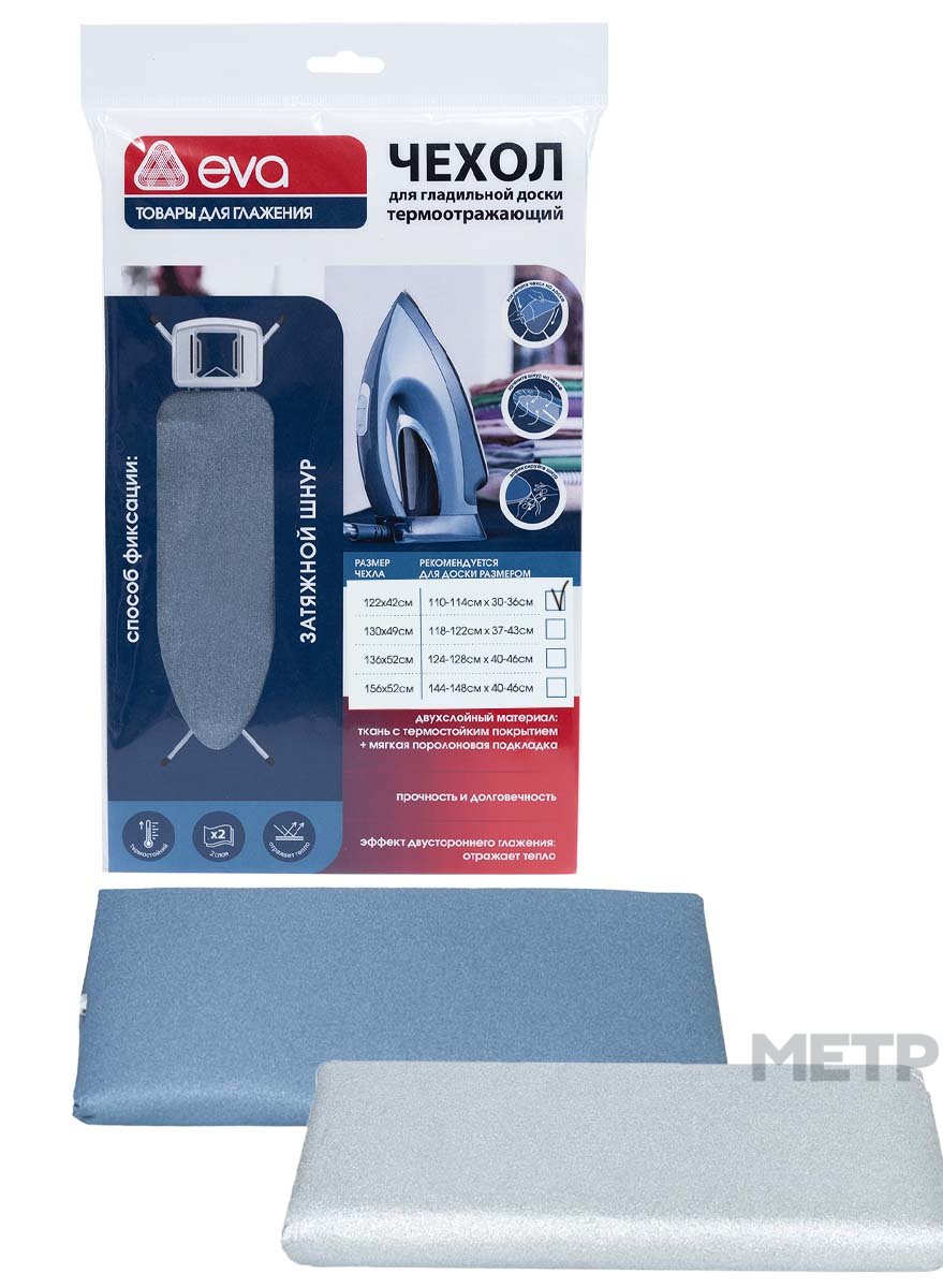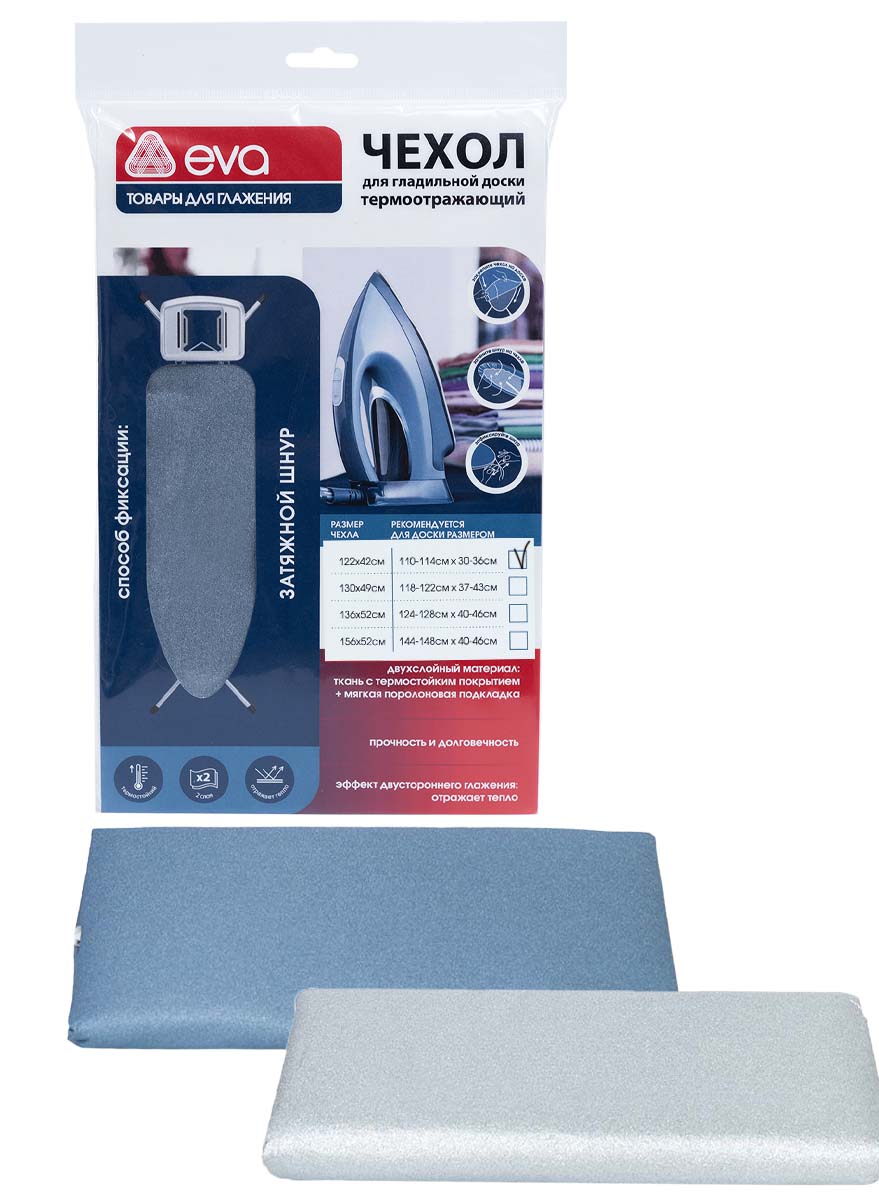 Чехол из ткани с термостойким покрытием подходит для гладильных досок размером 110-114х30-36см. Подложка - поролон толщиной 2 мм
