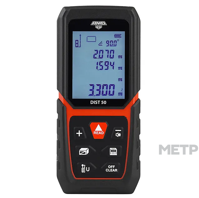 Лазерный дальномер AMO DIST 50 с угломером предназначен для линейных измерений в диапазоне до 50 м с 2-миллиметровой точностью, контроля горизонтальных и вертикальных размеров и расстояний с одновременным отслеживанием угла наклона или возвышения прибора, а также для выполнения разметки в ходе строительно-ремонтных, отделочных и других работ. Улучшенная пыле-влагозащита в соответствии с категорией IP 54, реализованная за счет использования мембранной клавиатуры и наличия заглушки для порта зарядки, дает возможность эксплуатировать прибор как при выполнении работ в помещениях, так и в полевых условиях.