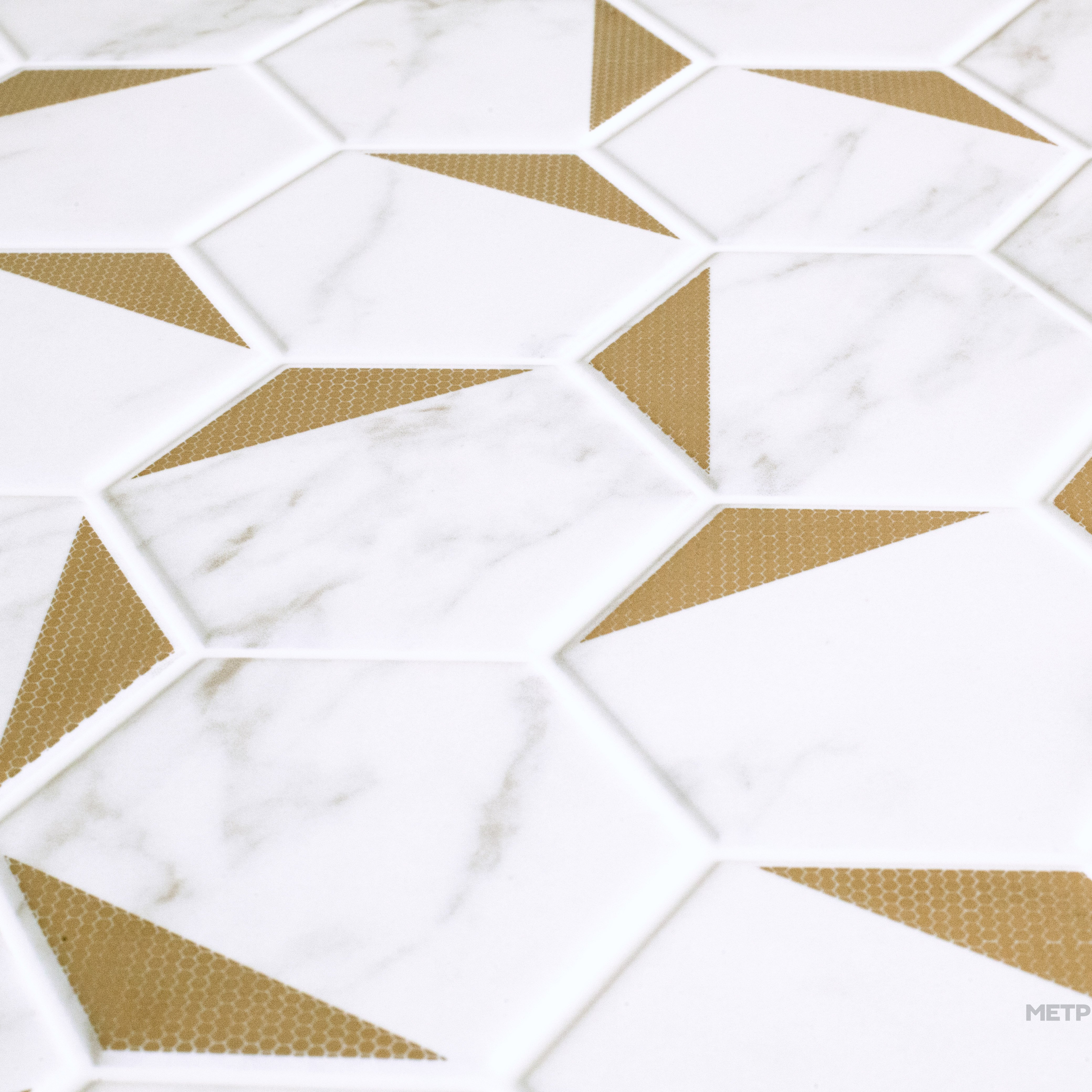 Декор настенный керамический Gold из коллекции Marble от фабрики Березакерамика выполнен в трендовом стиле сочетания золота и белого мрамора. Тонкие ромбы с золотыми вставками выглядят очень стильно и аккуратно. Коллекция выполнена в светлых оттенках, что идеально подходит для ванных небольшого размера, т.к. визуально добавляет им воздуха.