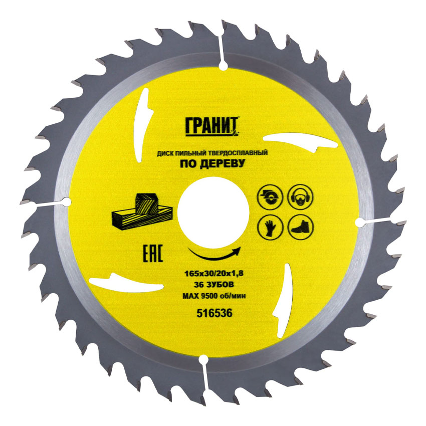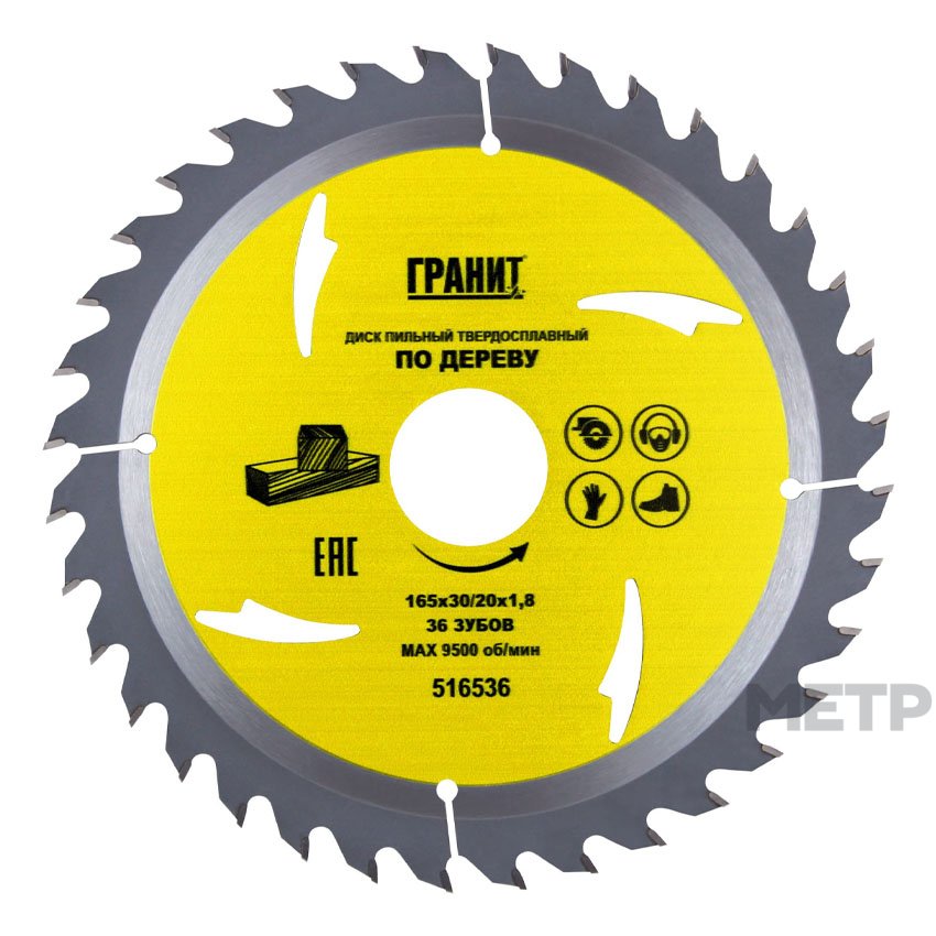 Диск пильный Гранит 165х30/20 мм 36Т, вариант полупрофи для работ по дереву, имеет универсальный рез. Изделие подходит для профессионального применения на деревообрабатывающих производствах, пригодится в частных домовладениях для самостоятельной подготовки строительных материалов.