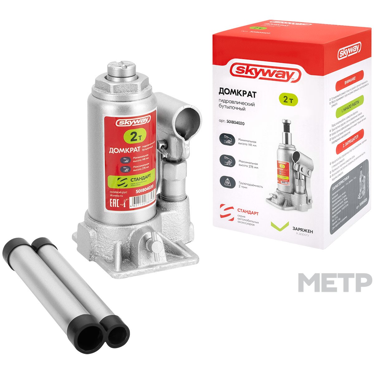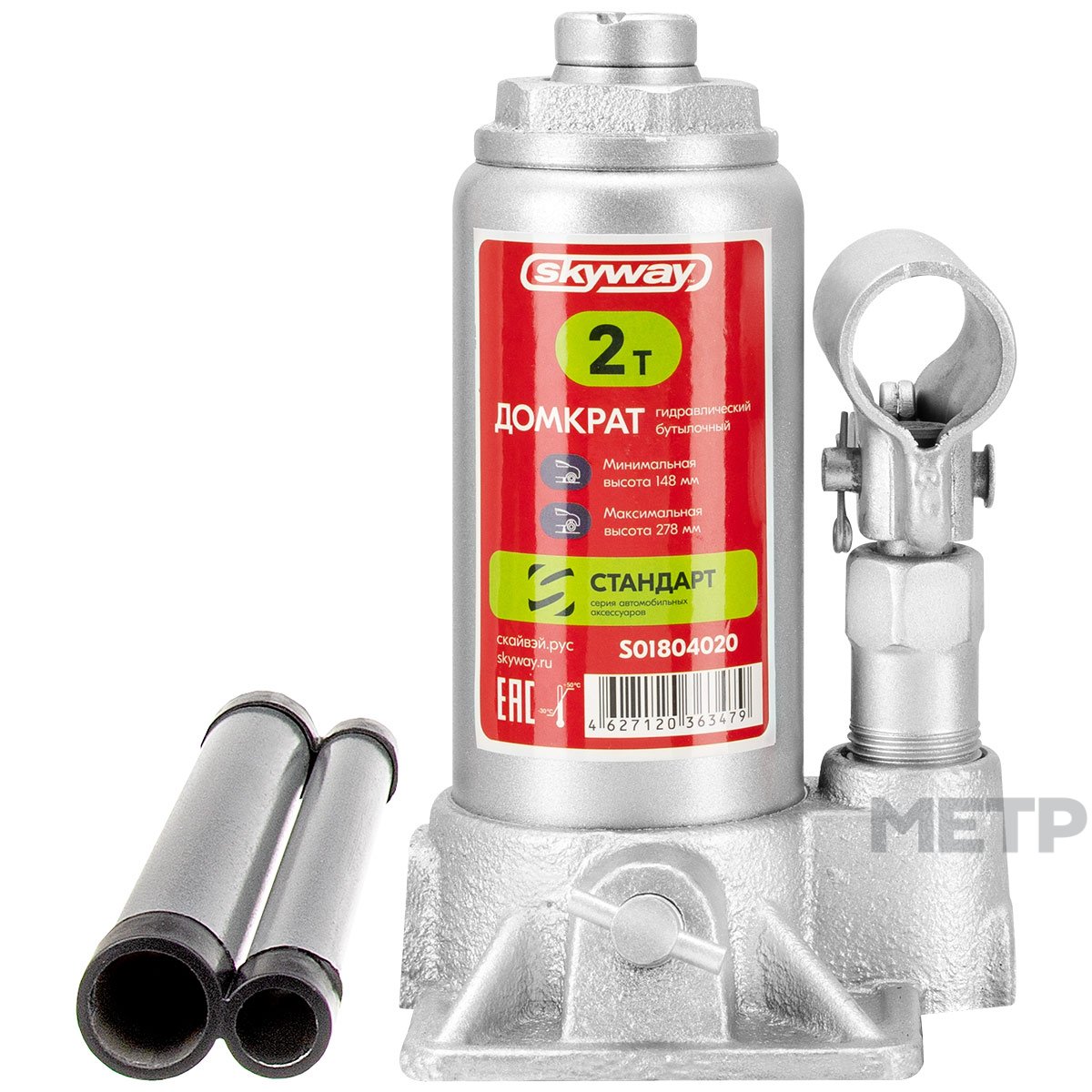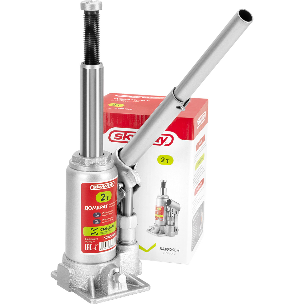 Домкрат бутылочный гидравлический SKYWAY 2 т - При небольших габаритах, он может поднять не только легковой автомобиль, но также и небольшой грузовой транспорт. Домкраты серии STANDART сочетают в себе простую и надежную конструкцию. Корпус и детали полностью металлические, что обеспечивает длительный срок безотказной службы по доступной цене.
