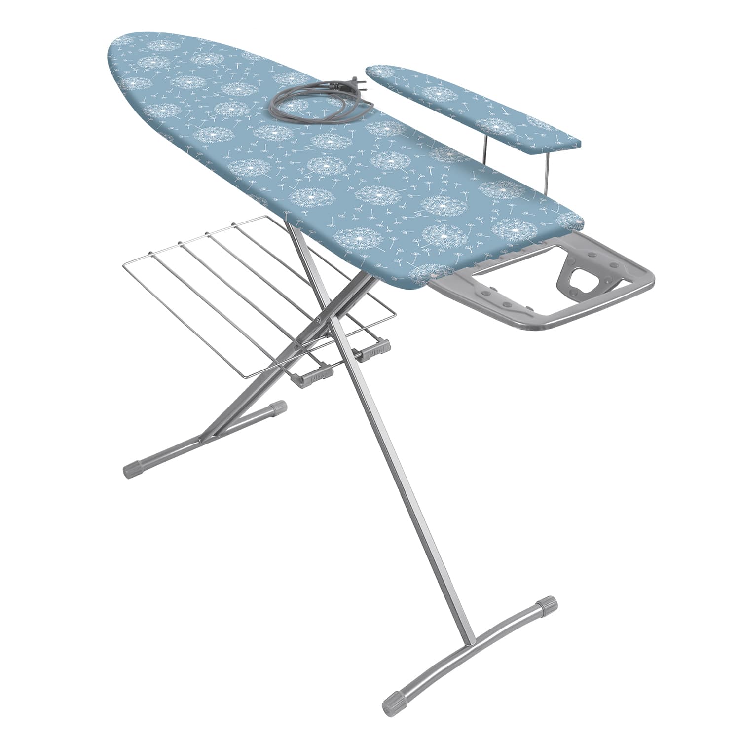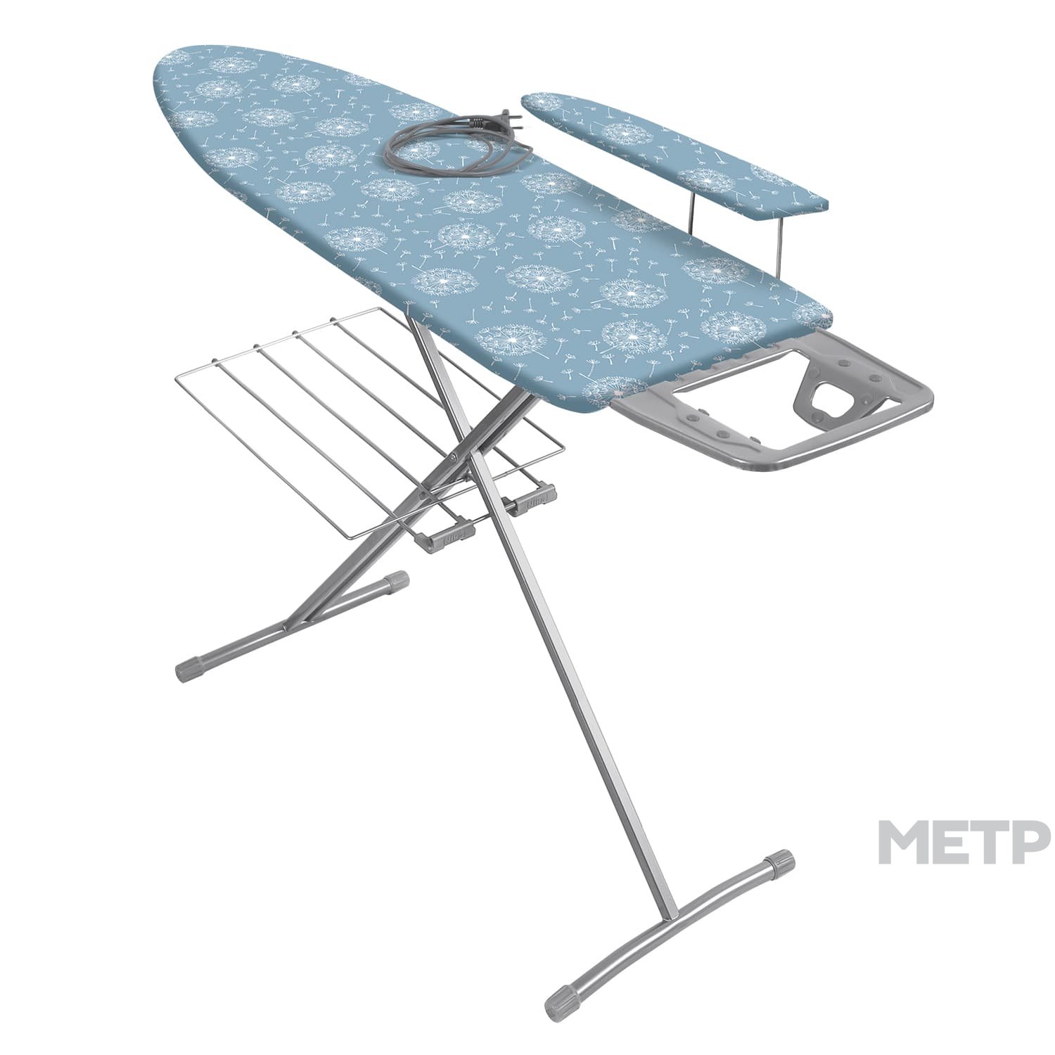 Гладильная доска изготовлена из прочных материалов. Встроенная розетка позволяет комфортно гладить без использования дополнительных удлинителей. Спeциальная подставка надежно фиксирyет утюг, не позволяя ему опрокинуться. Под доской распологается полка для белья.