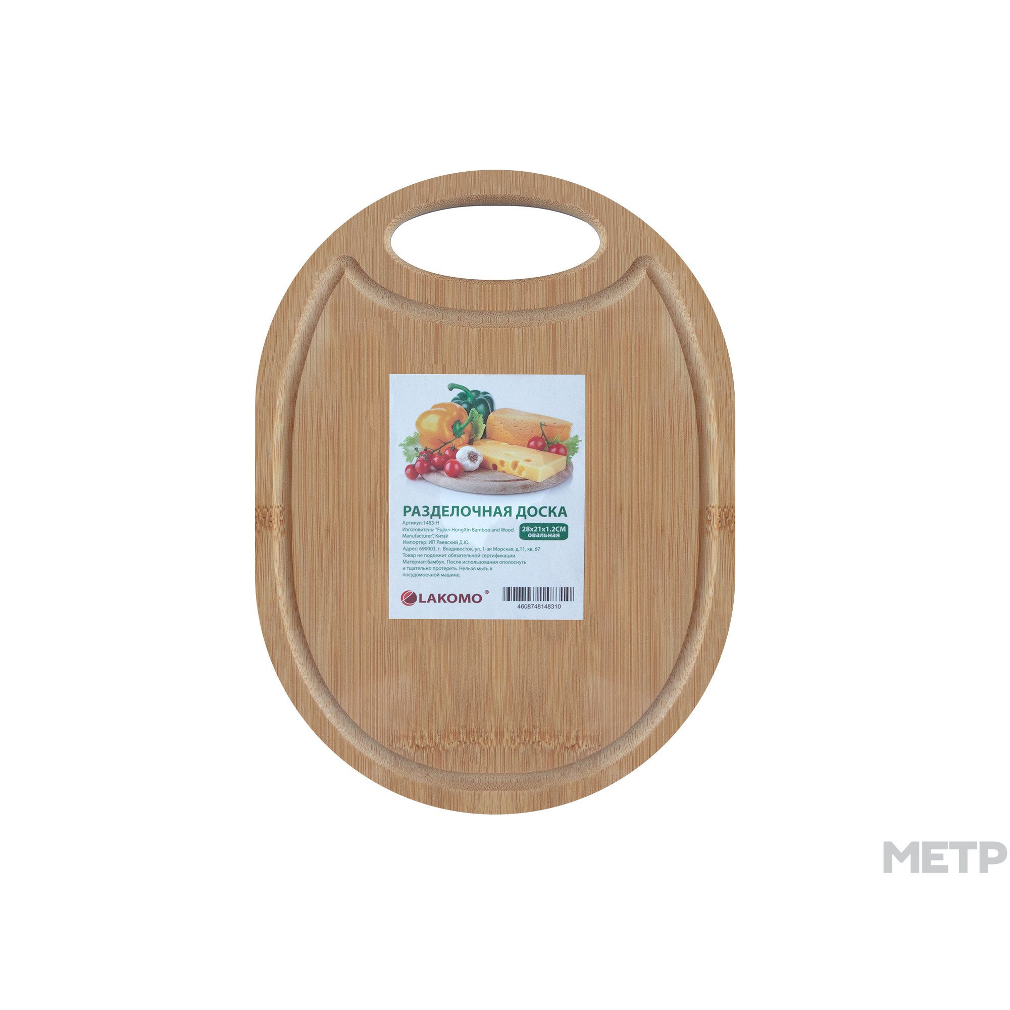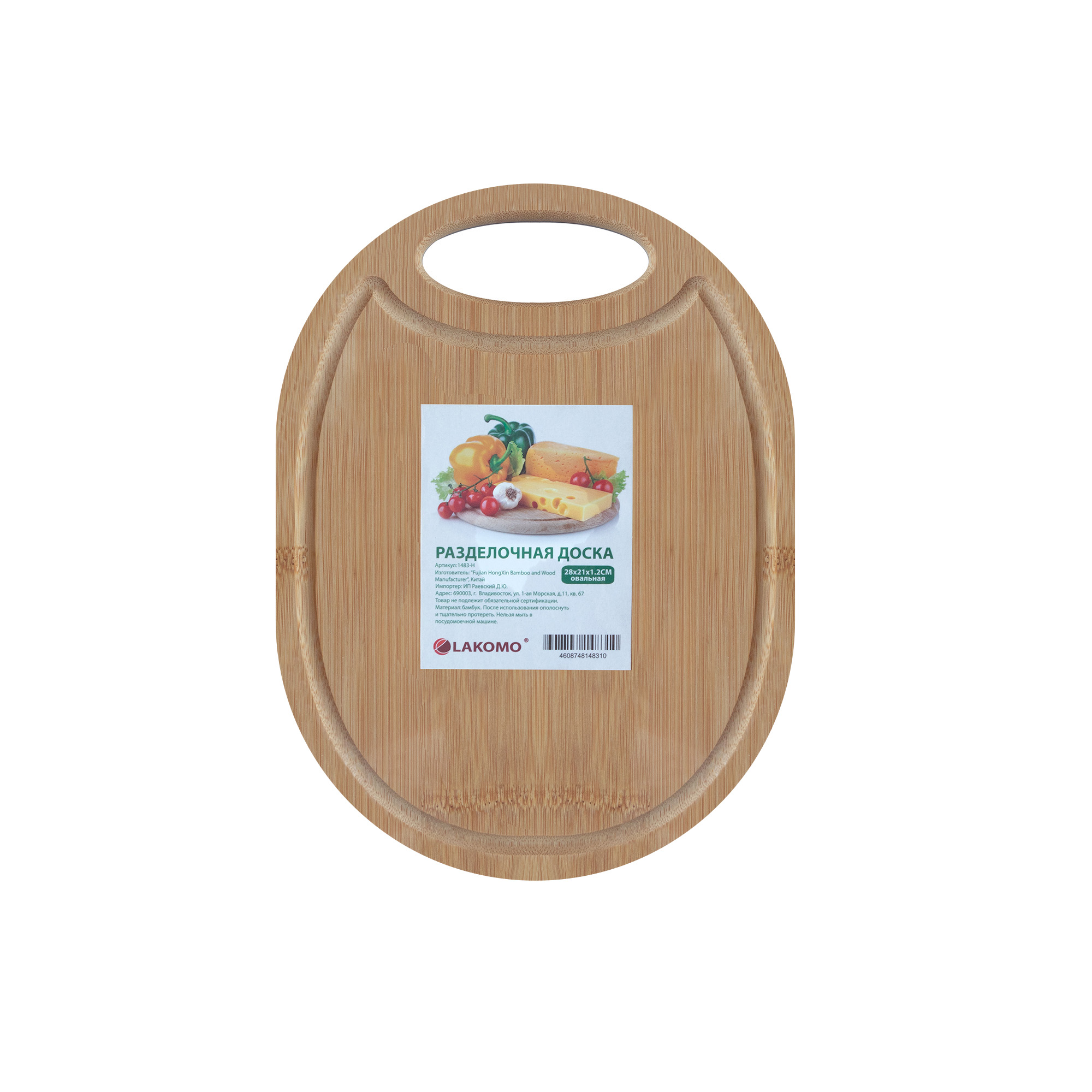 Доска разделочная 28х21х1,2 бамбук овал.Толщина 1,2см Дерево, экологически чистый продукт, который не насет вред здоровью при нарезке продуктов и в дальнейшем их употреблении. Бамбуковую разделочную доску LAKOMO можно применять на кухне для резки овощей, фруктов, рыбы, курицы. Изделие украшено надписями, поэтому доска может послужить идеальным подарком для любой хозяйки. Бамбуковая доска состоит из множества плюсов, например, она не тупит ножи при нарезке фруктов, овощей, мяса. И немаловажный факт для любой хозяйки, доска устойчиво лежит на столе и продукты по ней не скользят. Бамбуковая доска не впитывает запах рыбы, чеснока и не окрашивается свеклой. За ней легко ухаживать, чтобы привести в надлежащий вид, нужно доску промыть в теплой воде. У доски имеется небольшое круглое отверстие. Не рекомендуется пересушивать и надолго оставлять в воде и тогда срок службы увеличится. Нельзя мыть в посудомоечной машине.