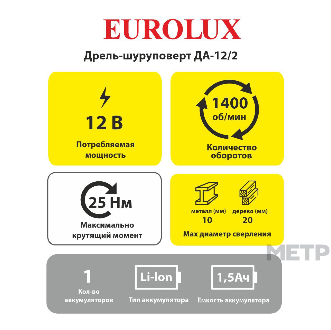Дрель-шуруповерт ДА-12/2 12B Li-lon 1,5Ач 1400об/м 13Нм Eurolux используется для сверления отверстий в деревянных, пластмассовых и металлических изделиях или для работы в качестве шуруповерта. Не требует подключения к сети, что позволяет использовать ее в помещениях, где нет доступа к системе электропитания. Рабочие элементы легко заменить благодаря быстрозажимному патрону. Для ослабления креплений и выкручивания шурупов есть обратный ход. Система охлаждения мотора за счет вентиляционных отверстий на корпусе. С помощью регулировки частоты вращения инструмент можно настроить под необходимую толщину материала. Модель работает от надёжного литий-ионного аккумулятора (Li-Ion). Незаменимый помощник мастера в ремонте или строительстве.