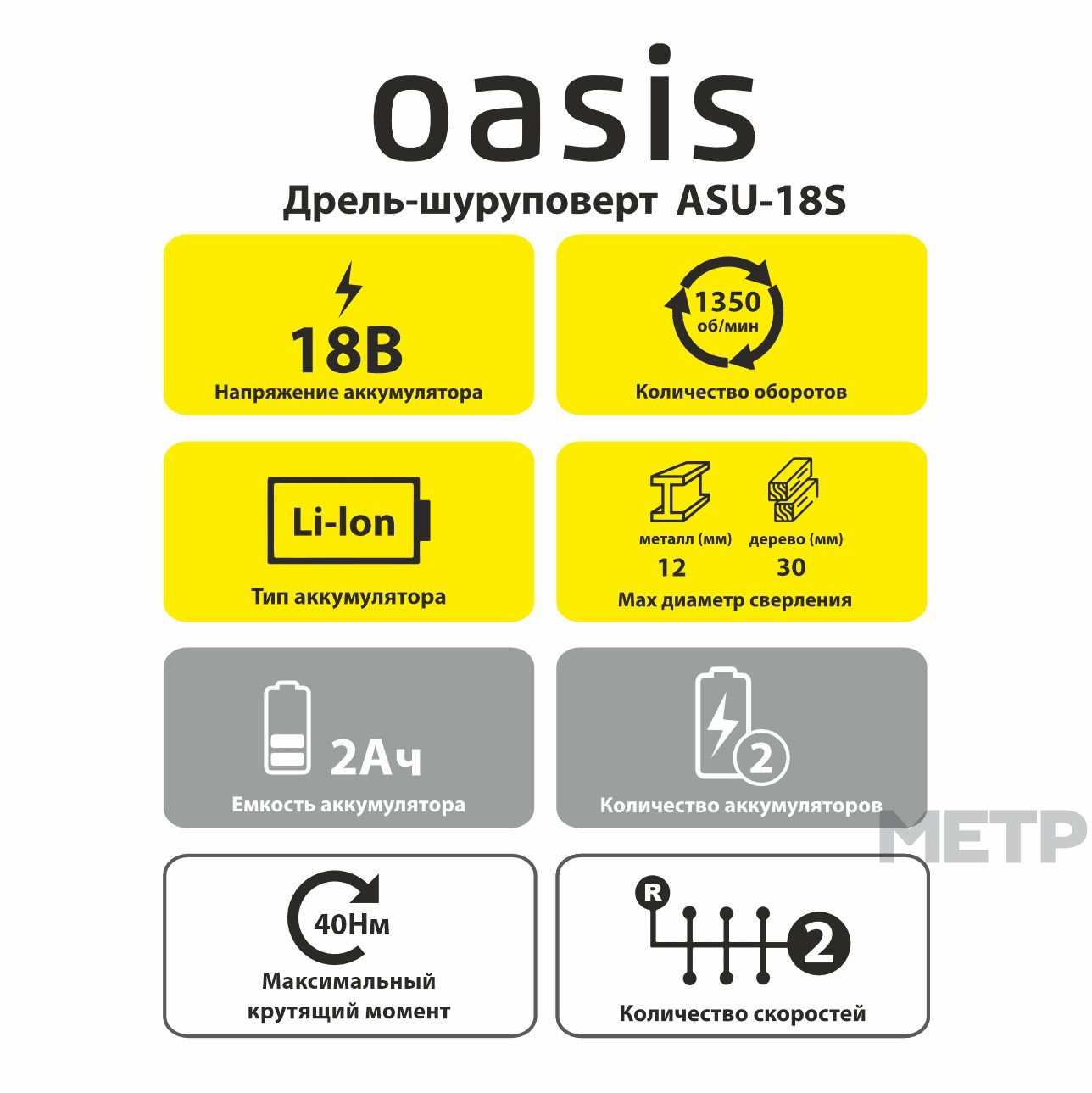 Дрель-шуруповерт ударная ASU-18S 18Bх2 Li-lon 2Ач 1350об/м 40Нм Oasis это универсальная, ударная, компактная и легкая дрель-шуруповерт. Имеет быстрозажимной 10 мм патром с блокировкой шпинделя, фиксация оснастки одной рукой. Две рабочие скорости: одна предназначена для работы с крепежом, а вторая – для сверления. Наличие муфты регулировки крутящего момента (18+1 позиций ступеней) позволит максимально точно выбрать режим работы. Дрель оснащена светодиодной подсветкой рабочей зоны.
