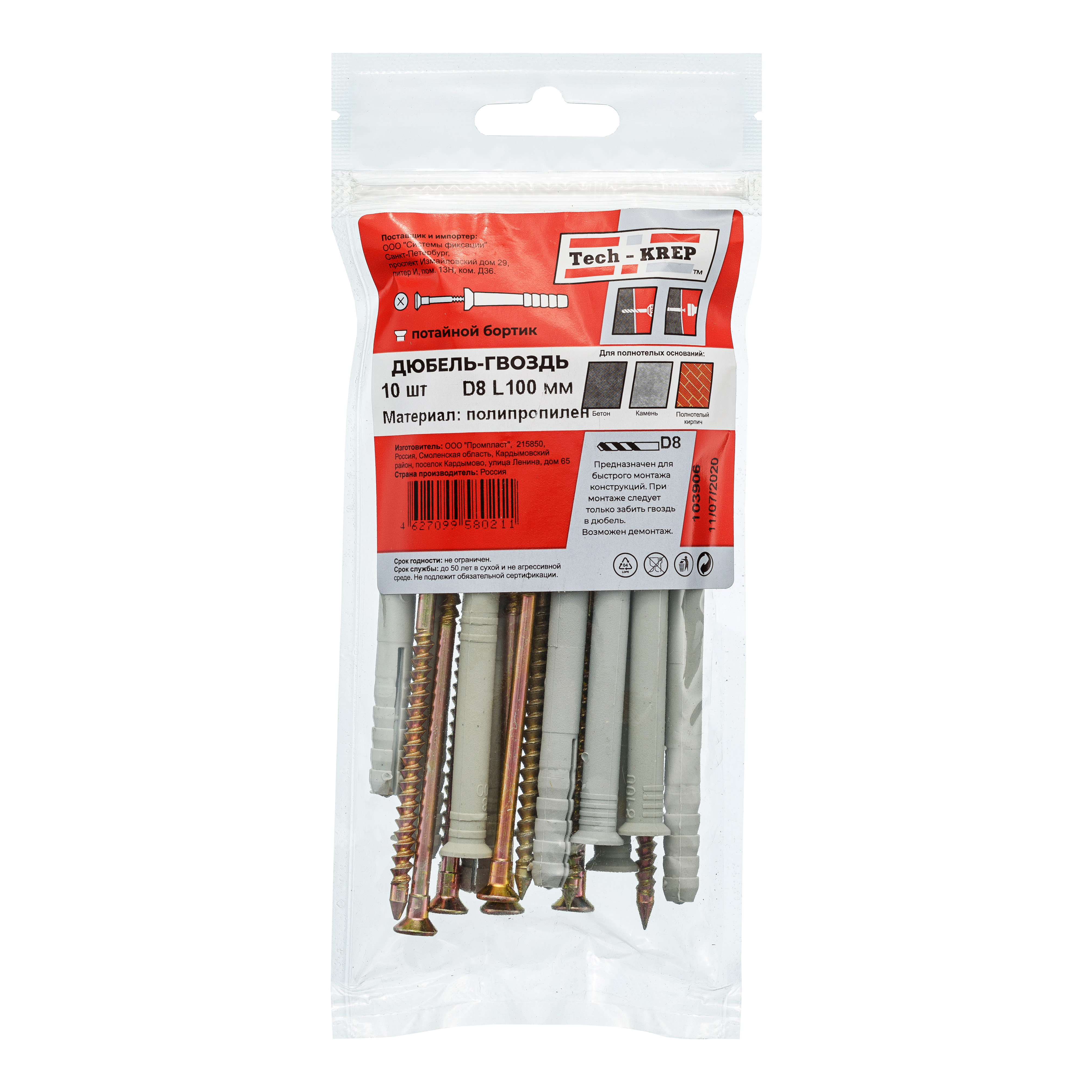 Дюбель-гвоздь 8х100мм потайной бортик полипропиленовый 10шт пакет