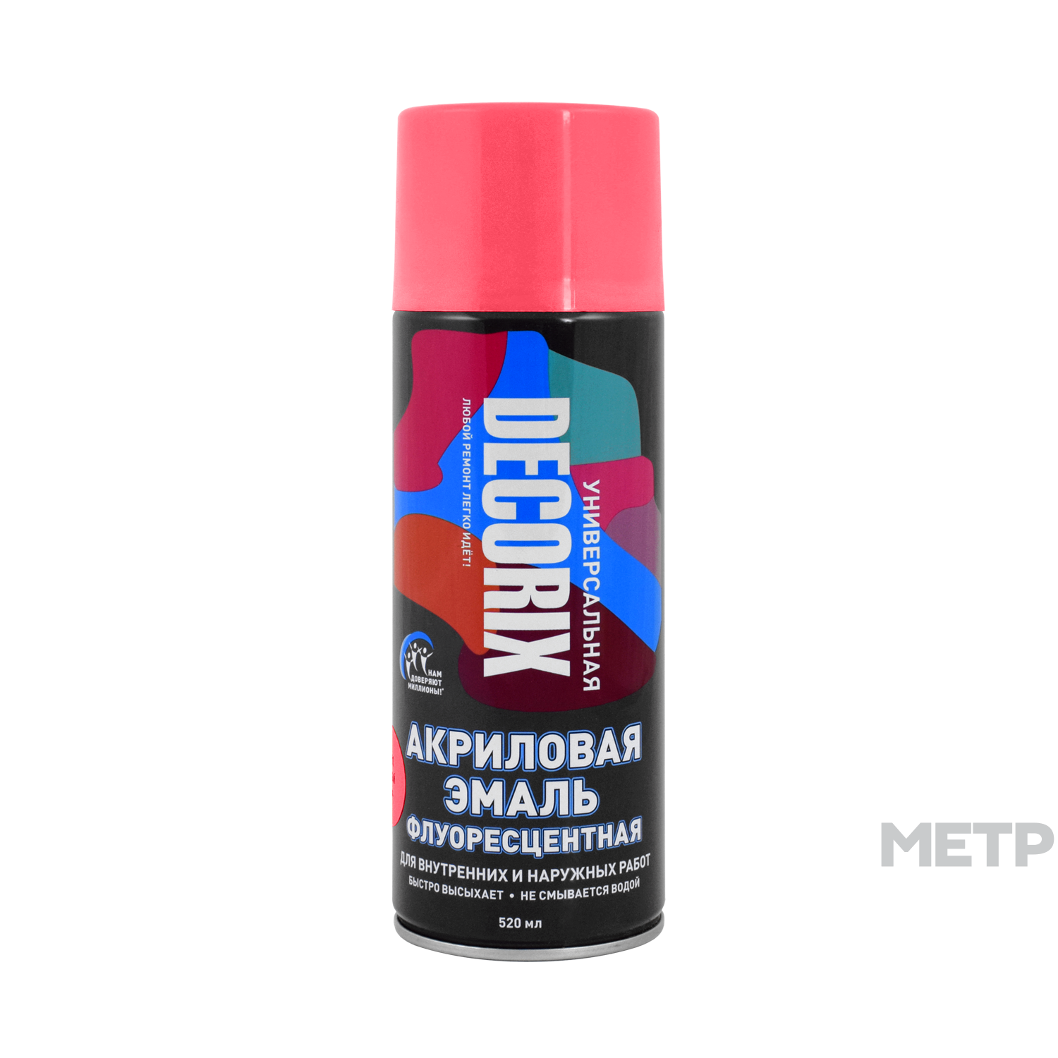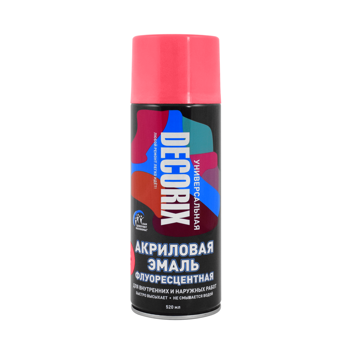 Высококачественная универсальная акриловая эмаль с флуоресцентным эффектом DECORIX аэрозольная розовая матовая 520 мл используется в декоративно-оформительских работах, строительстве и ремонте.