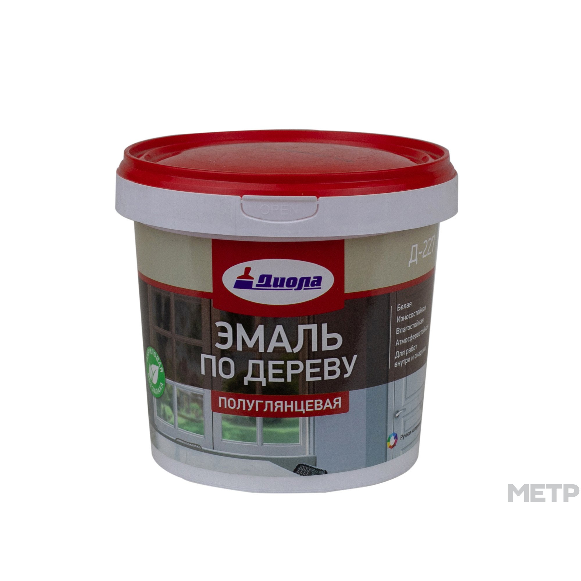 Эмаль акриловая Диола-227 по дереву белая полуглянцевая 0,9 кг, применяется для окрашивания изделий из дерева, окон и дверей. Эмаль образует прочное покрытие, устойчивое к мытью, механическим повреждениям и воздействию атмосферных осадков. Для работ внутри и снаружи помещений. Образует паропроницаемое, износоустойчивое, полуглянцевое покрытие и обладает высокой прочностью, водо- и атмосферостойкостью выдерживает многократную влажную уборку с использованием СМС и без запаха, экологически безопасна.