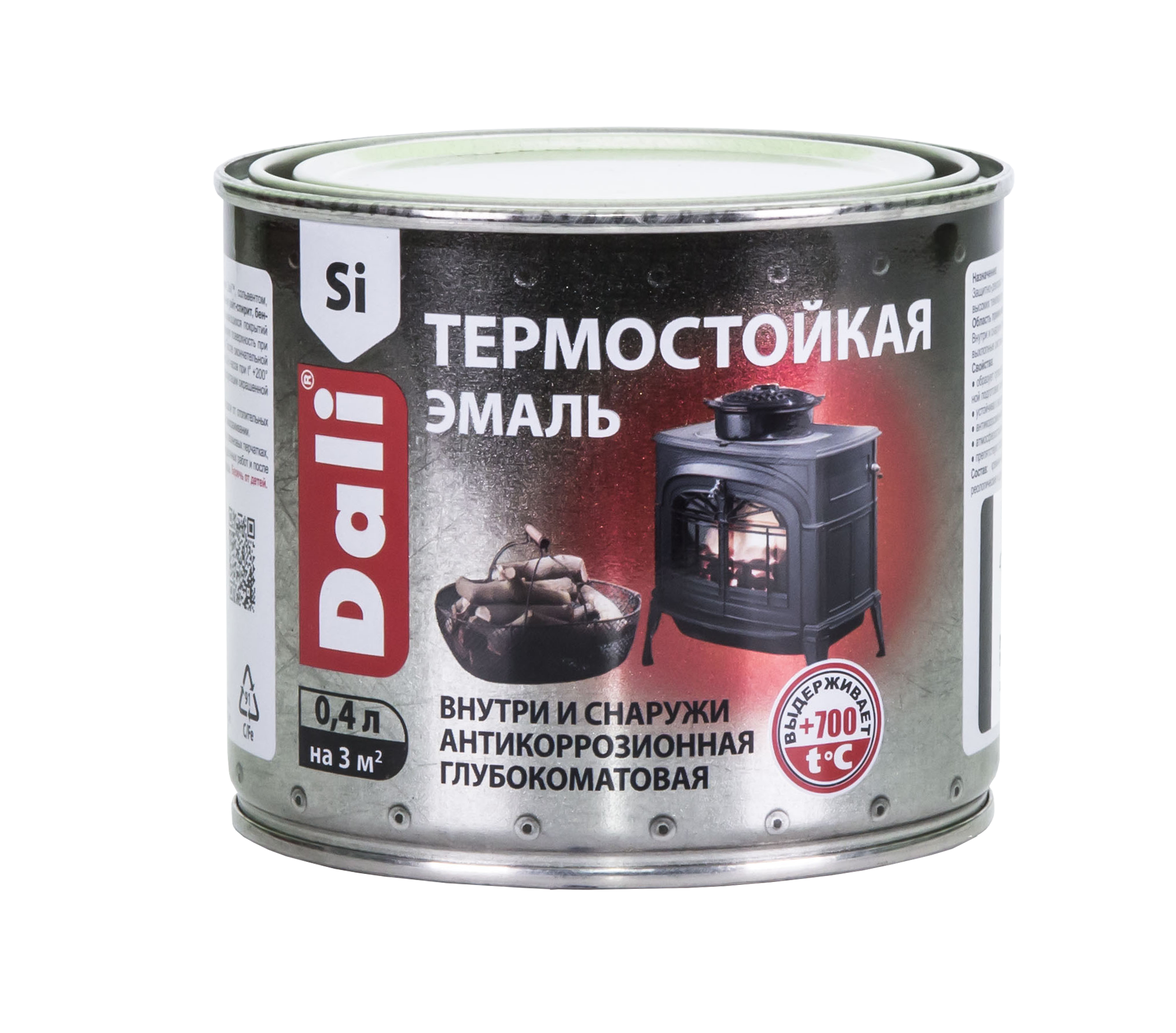 Эмаль термостойкая Dali матовая черная 0,4 кг, предназначена для защитно-декоративной обработки металлического оборудования и поверхностей, подвергающихся воздействию высоких температур. Применяется внутри и снаружи помещений по стальным (в т. ч. нержавеющая сталь) и чугунным поверхностям (печи, дымоходы, выхлопные системы автомобилей, внешние стороны мангалов и пр.), подвергающимся нагреву до 600⁰С.