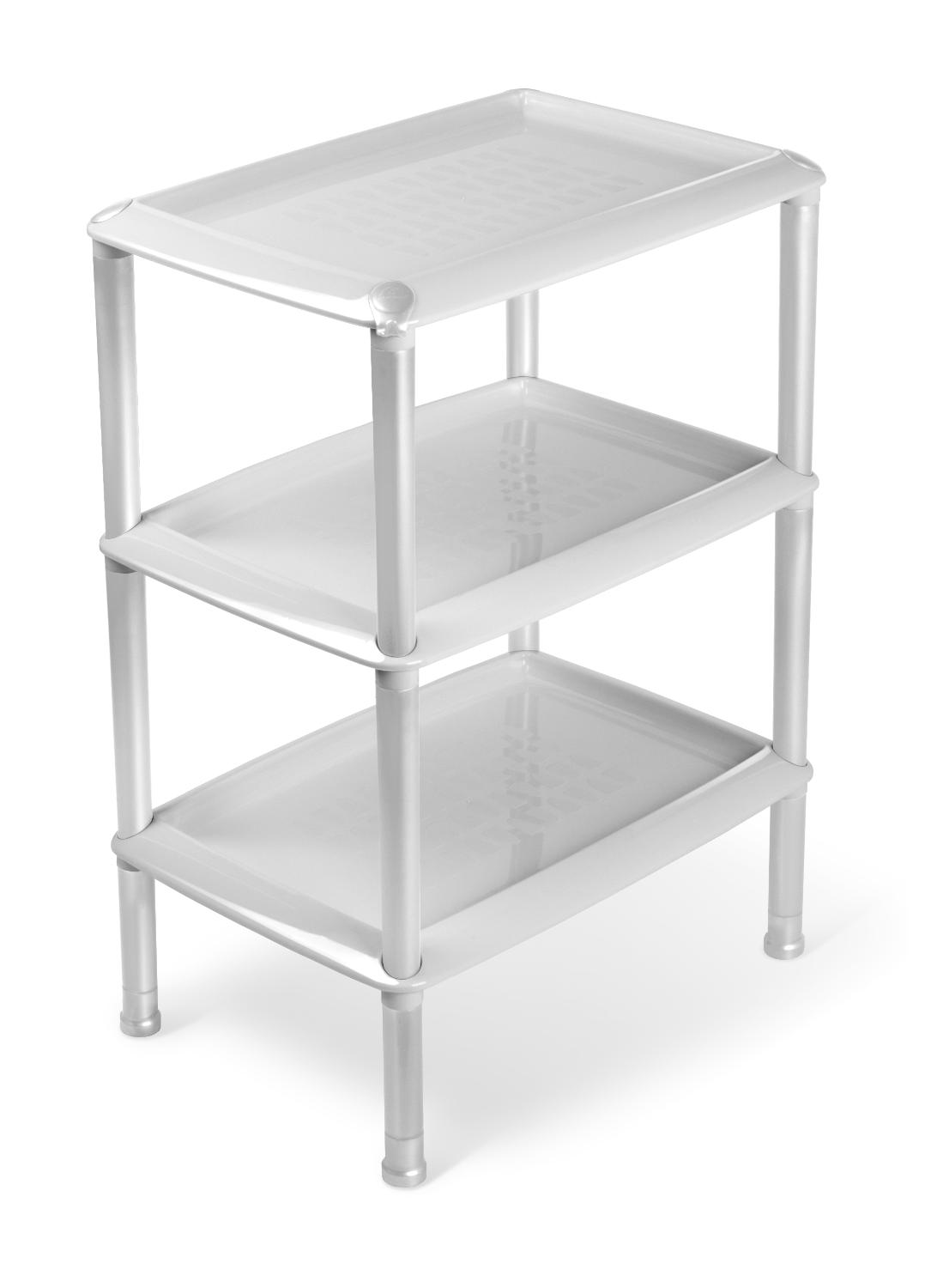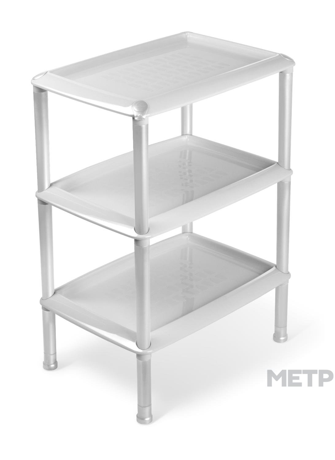 Этажерка позволит организовать пространство в небольшом помещении, например в прихожей или ванной. Пластик хорошо переносит влажность. Ухаживать за ним также легко - очистить поверхность полок можно при помощи обычных моющих средств без применения абразивных материалов. Нескользящая поверхность и бортики по краям полок обеспечат устойчивость размещенных предметов. Для удобного перемещения по комнате этажерка снабжена колесами. Рекомендуемая общая нагрузка на этажерку до 8 кг. Размер этажерки в собранном виде составляет 440x310x537 мм.