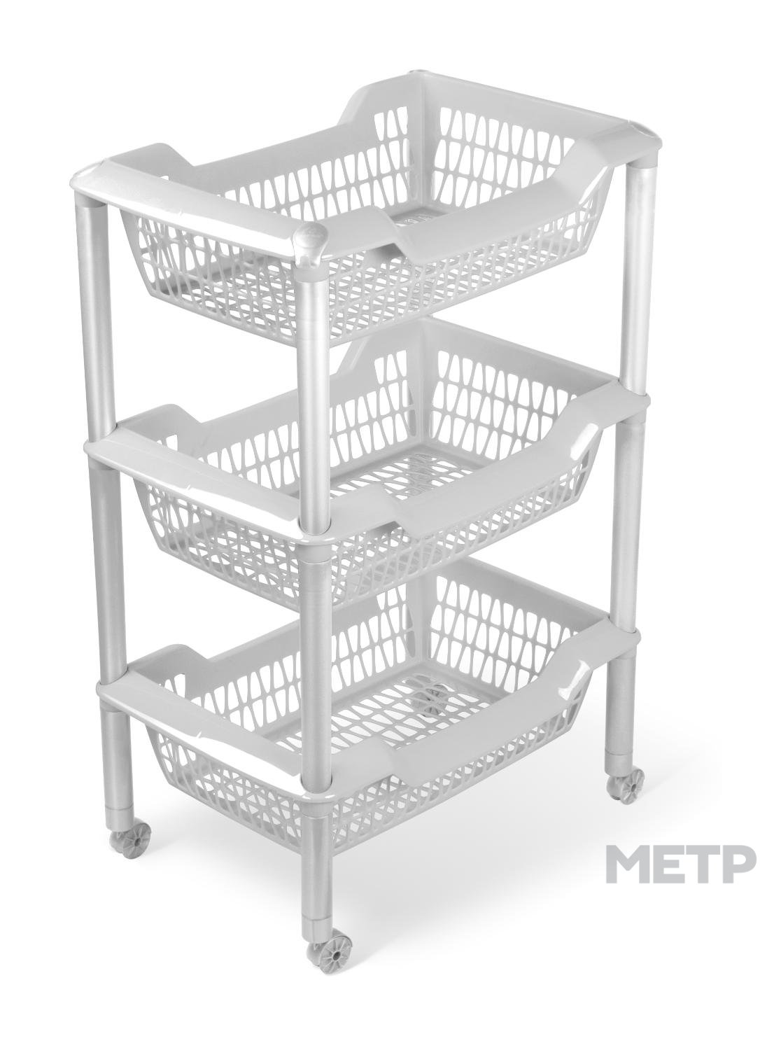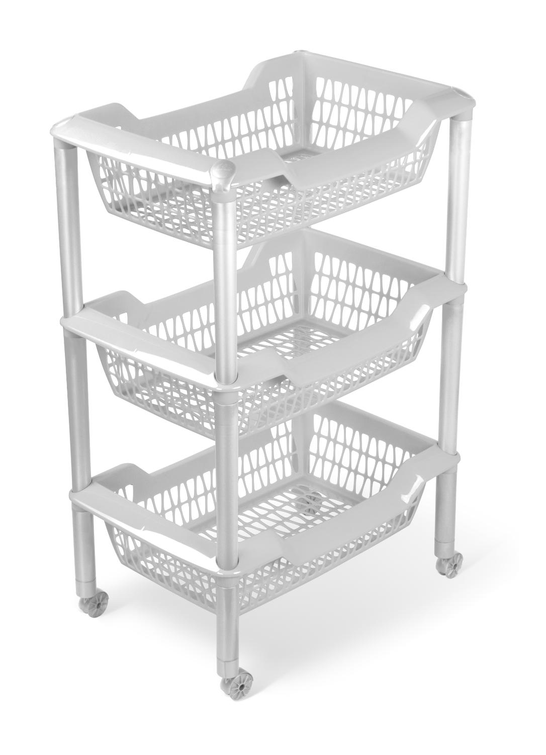 Этажерка с корзинами отлично подойдет для хранения овощей и фруктов, средств гигиены, бытовой химии и других предметов. Это отличное решение для малогабаритной квартиры - поможет быстро разместить необходимые вещи в ванной, прихожей или детской. Для удобного перемещения по комнате этажерка снабжена колесами. Пластик хорошо переносит влажность. Ухаживать за ним также легко - очистить поверхность можно при помощи обычных моющих средств без применения абразивных материалов. Рекомендуемая общая нагрузка на этажерку до 8 кг. Размер этажерки в собранном виде составляет 440x304x665 мм.