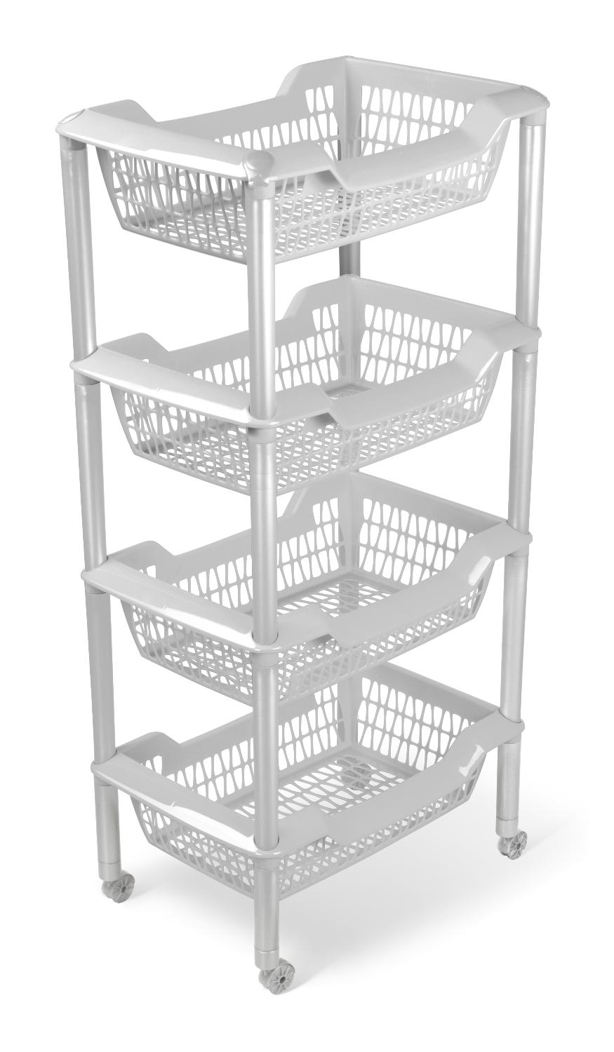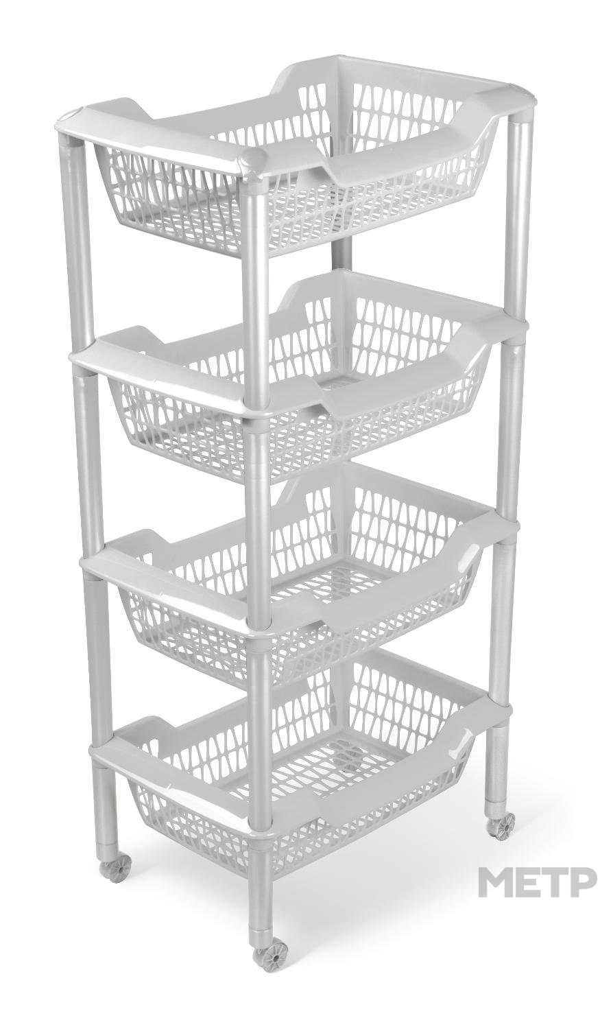 Этажерка с корзинами отлично подойдет для хранения овощей и фруктов, средств гигиены, бытовой химии и других предметов. Это отличное решение для малогабаритной квартиры - поможет быстро разместить необходимые вещи в ванной, прихожей или детской. Для удобного перемещения по комнате этажерка снабжена колесами. Пластик хорошо переносит влажность. Ухаживать за ним также легко - очистить поверхность можно при помощи обычных моющих средств без применения абразивных материалов. Рекомендуемая общая нагрузка на этажерку до 8 кг. Размер этажерки в собранном виде составляет 440x304x896 мм.