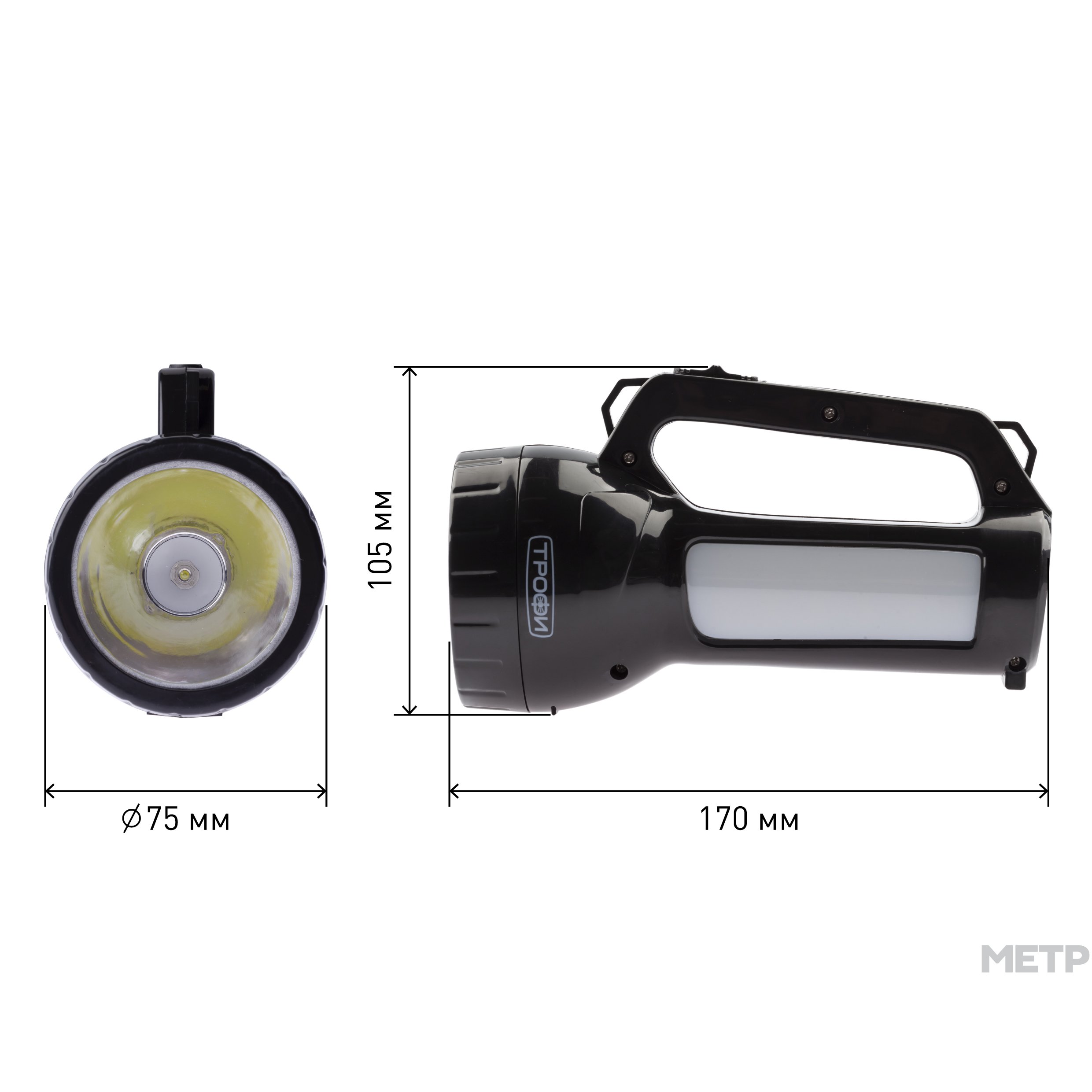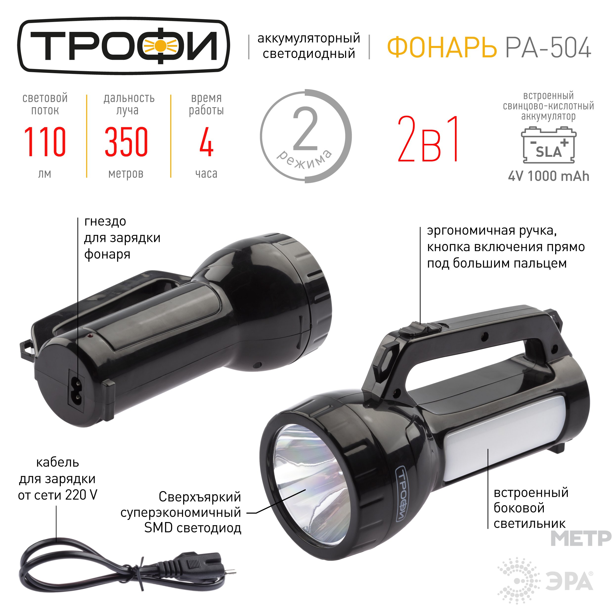 Фонарь прожектор ТРОФИ 1 Вт PA-504 черный- это ручной аккумуляторный фонарь с боковым светильником. Во фронтальной части установлен мощный SMD-диод с дальним направленным светом, светильник состоит из 12 светодиодов с заливающим ближним светом. Для работы фонаря не требуются батарейки, одной подзарядки устройства хватает на 4 часа непрерывной работы. Эргономичная ручка, кнопка включения прямо под большим пальцем. С помощью этого простого в управлении фонаря можно эффективно освещать путь или организовать освещение на привале, поставив Трофи PA-504 на ровную поверхность в качестве настольного светильника.