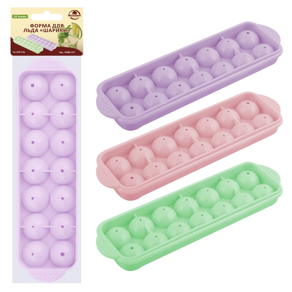 Пластмассовая форма для льда «Шарики» — простой и очень удобный вариант для заготовки ледяных шариков для коктейлей, напитков, замораживания отваров трав, лимонного сока, листьев мяты и специй. Изделие имеет 14 ячеек