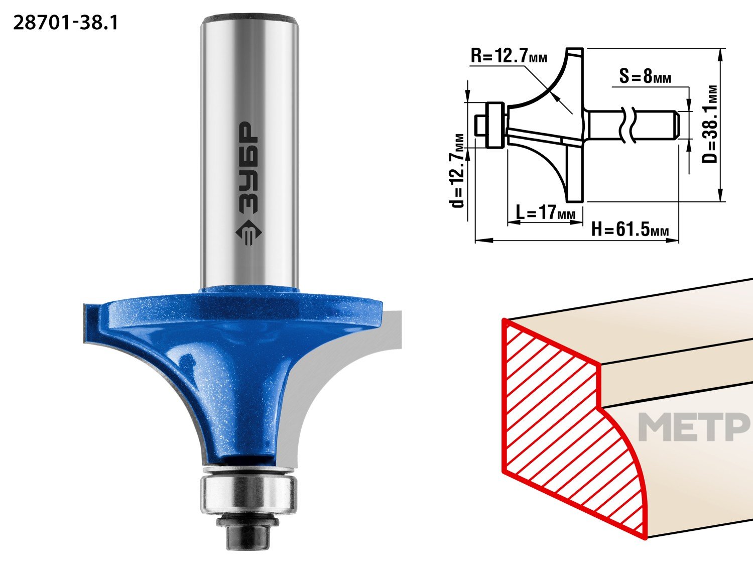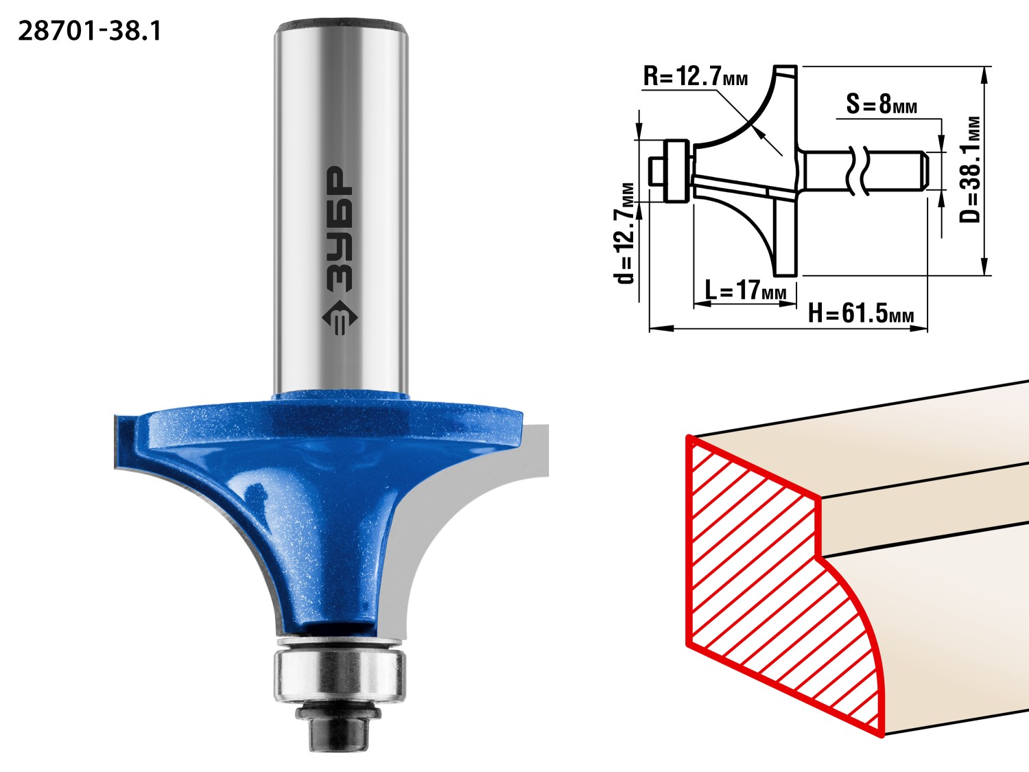 Фреза кромочная калевочная №1 38,1х17мм радиус 12,7мм предназначена для скругления кромок при обработке столешниц, полок, шкафов и прочих работ с разнообразными видами древесины.