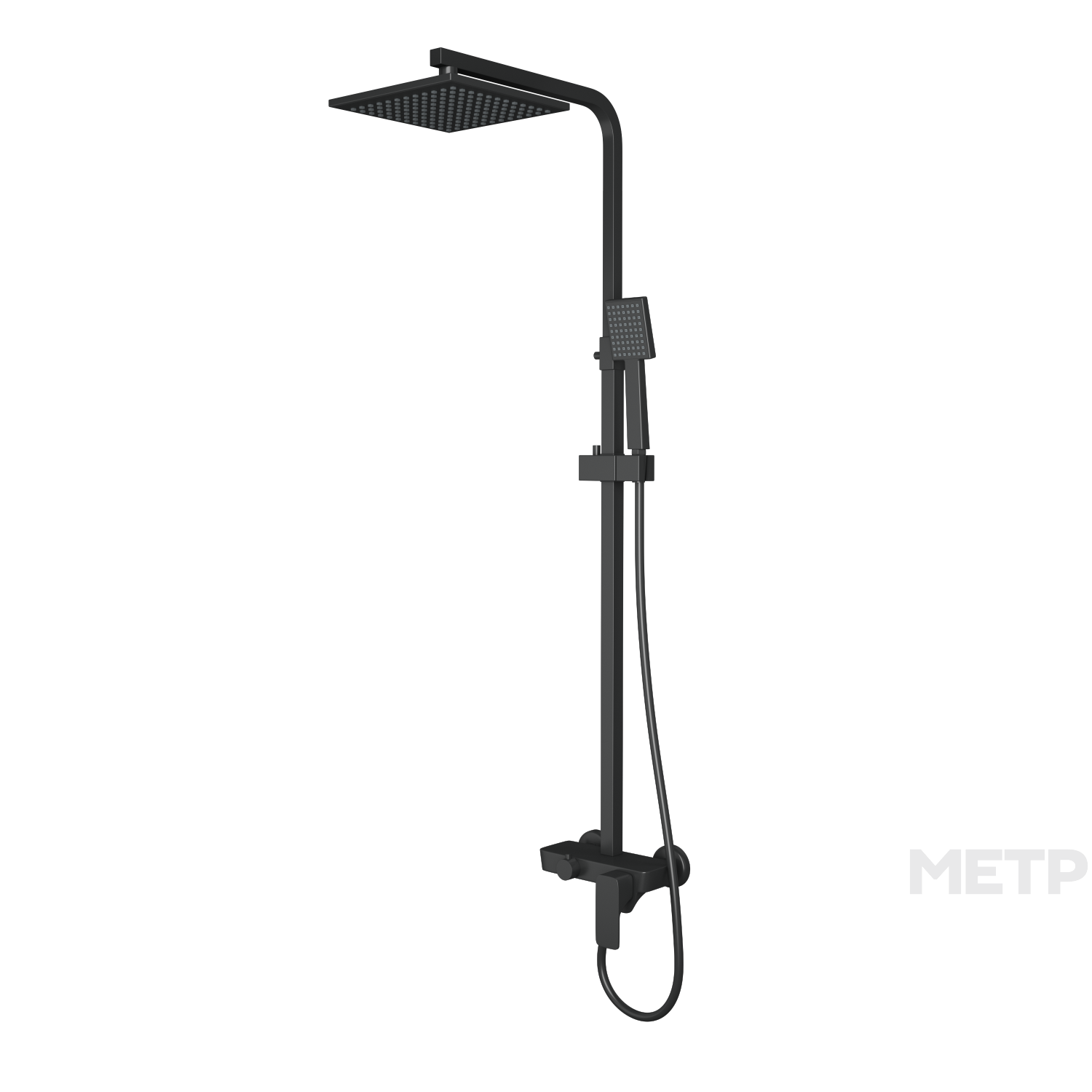 Гарнитур душевой со смесителемдешевой лейкой и тропическим душем Technische черный, матовый изготовлен из латуни. Имеет регулируемую штангу, оснащен керамическим картриджем, изливом для ванны, 150-сантиметровым шлангом и трехрежимной лейкой из ABS-пластика