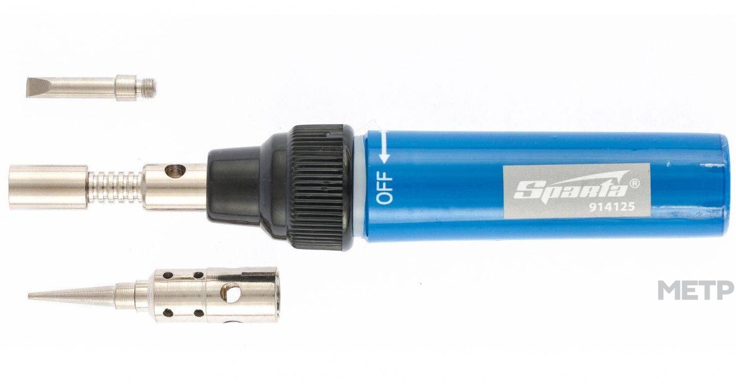 Газовая горелка 1,3 л Sparta тип "Карандаш", в комплекте две насадки для пайки, предусмотрена регулировка пламени по уровню, используемый газ – бутан. Данный инструмент представляет собой разновидность микропаяльника, при этом более универсален в повседневном применении, компактен и удобен.