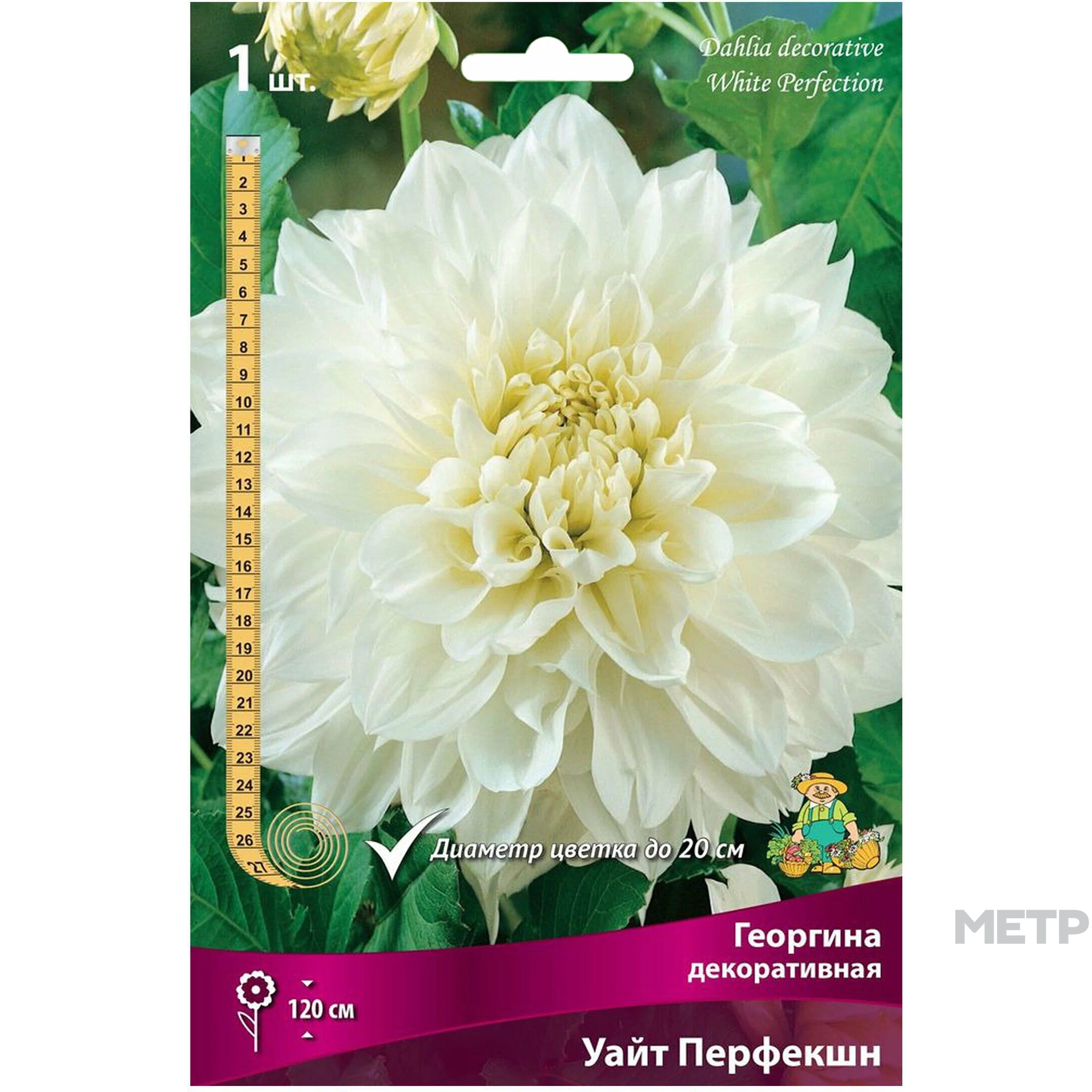 Многолетник Георгина Уайт Перфекшн. Высота растения 120см. Соцветия густо-махровые с плоскими широкими, закругленными на концах лепестками белой окраски, достигают диаметра 15-18см. Цветение наступает в августе.