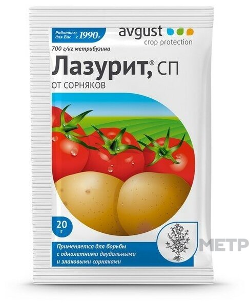 Гербицид Avgust Лазурит 20 гр. — эффективный продукт для уничтожения картофельных сорняков — лебеды, амброзии, бодяка, щирицы и прочих (злаковых и двудольных). Уничтожит как прорастающие, так и уже проросшие ненужные растения, не навредив картофелю. Защищает посадки в течение 1-2 месяцев.