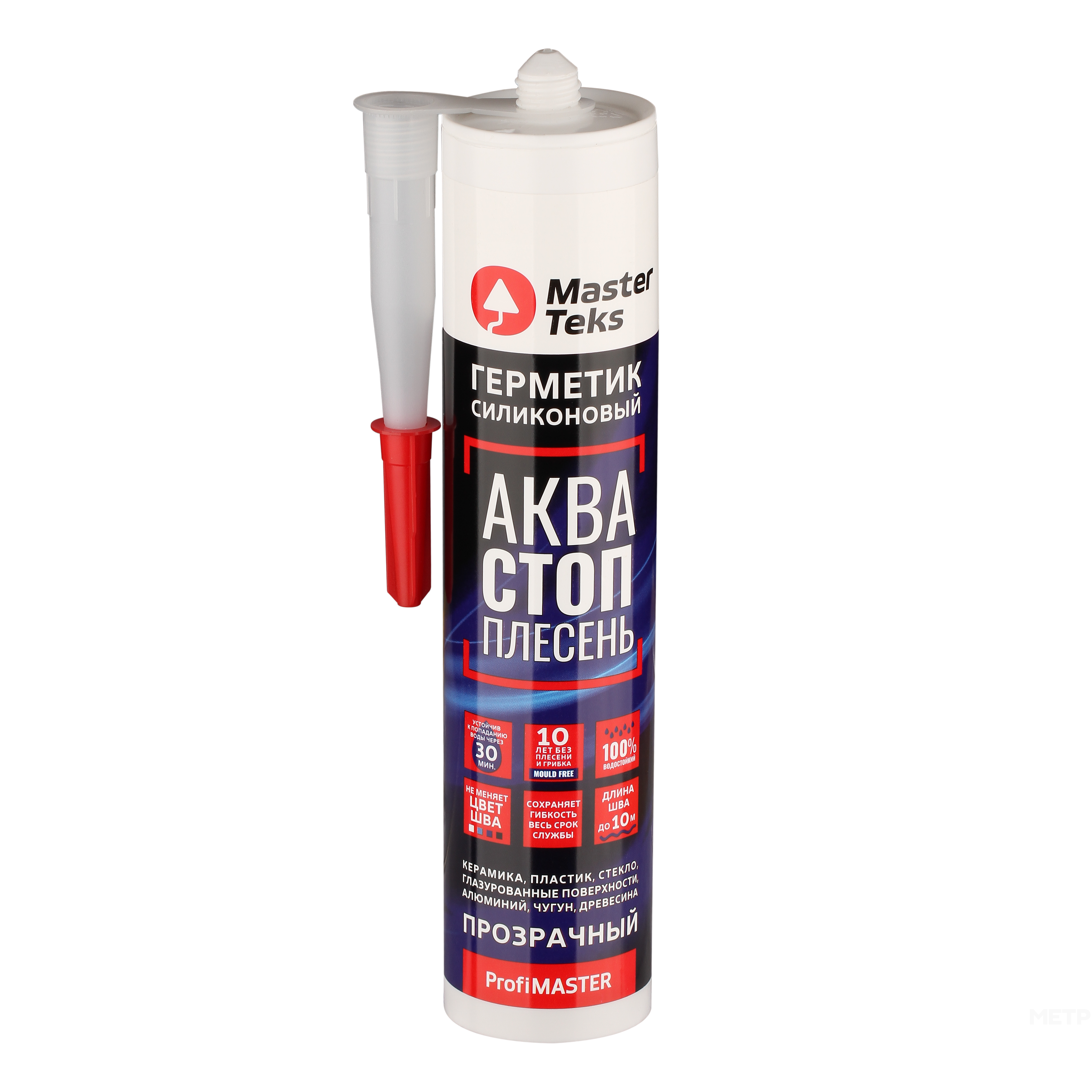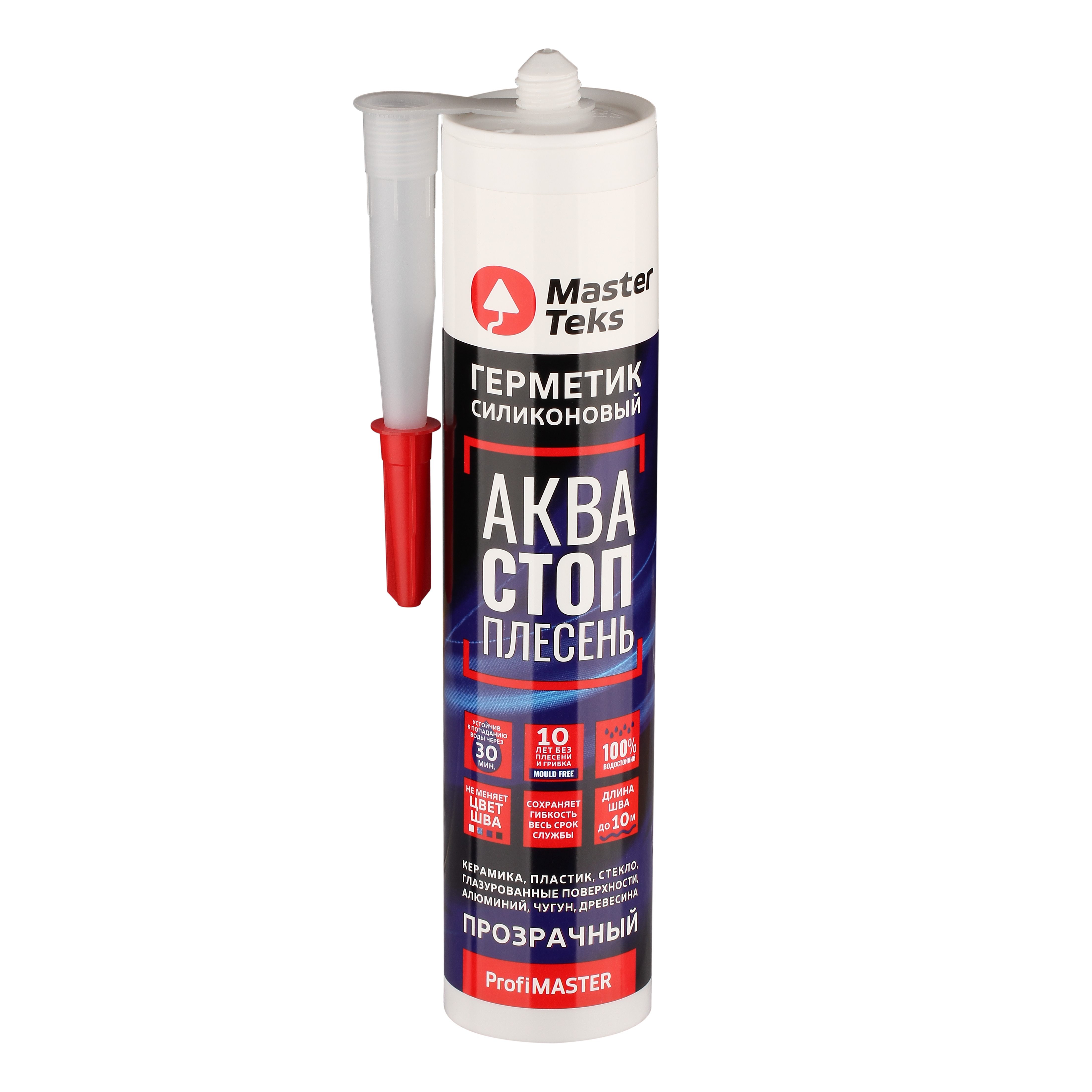 Высокотехнологичный однокомпонентный силиконовый герметик ProfiMaster акваСТОПплесень прозрачный 280 мл кислотного типа, содержащий антисептические средства, препятствующие образованию грибка и плесени и позволяющие применение в помещениях с повышенной влажностью. Отличается долговечностью и высокой прочностью.