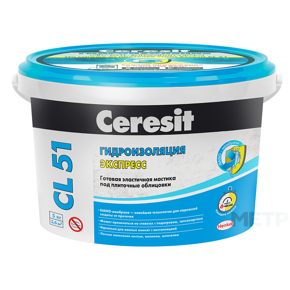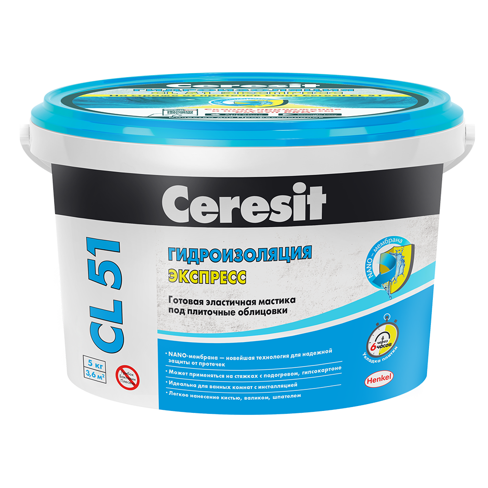 Гидроизоляция эластичная CL 51 5 кг предназначена для устройства эластичных водонепроницаемых покрытий перед устройством плиточных облицовок в помещениях, подверженных периодическому увлажнению (ванных, душевых, туалетах, кухнях и т.д.). Легко наносится кистью, валиком или шпателем. Перекрывает трещины раскрытием до 0,75 мм. Пригодна только для внутренних работ. Может применяться на стяжках с подогревом и на гипсокартоне. Не содержит растворителей.