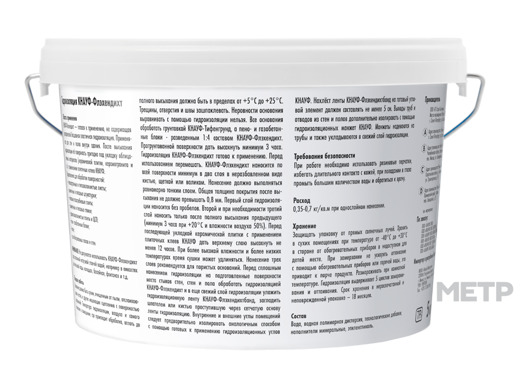 Гидроизоляция Knauf-Флэхэндихт 5 кг предназначена для: гидроизоляции влажных и сырых помещений, например, ванных, душевых, и других помещений; гидроизоляции чувствительных к влаге оснований (гипсовая штукатурка, гипсокартонные и гипсоволокнистые листы, гипсовые стяжки, блоки, плиты и т.д.); гидроизоляции гигроскопичных минеральных оснований (известковые, известково-цементные и цементные штукатурки, цементные плиты, цементные стяжки, бетон, пористый бетон и т.д.); создания водонепроницаемой, эластичной гидроизоляции перед укладкой покрытий из керамической плитки и природного камня в том числе, и при устройстве обогреваемых полов и стен.