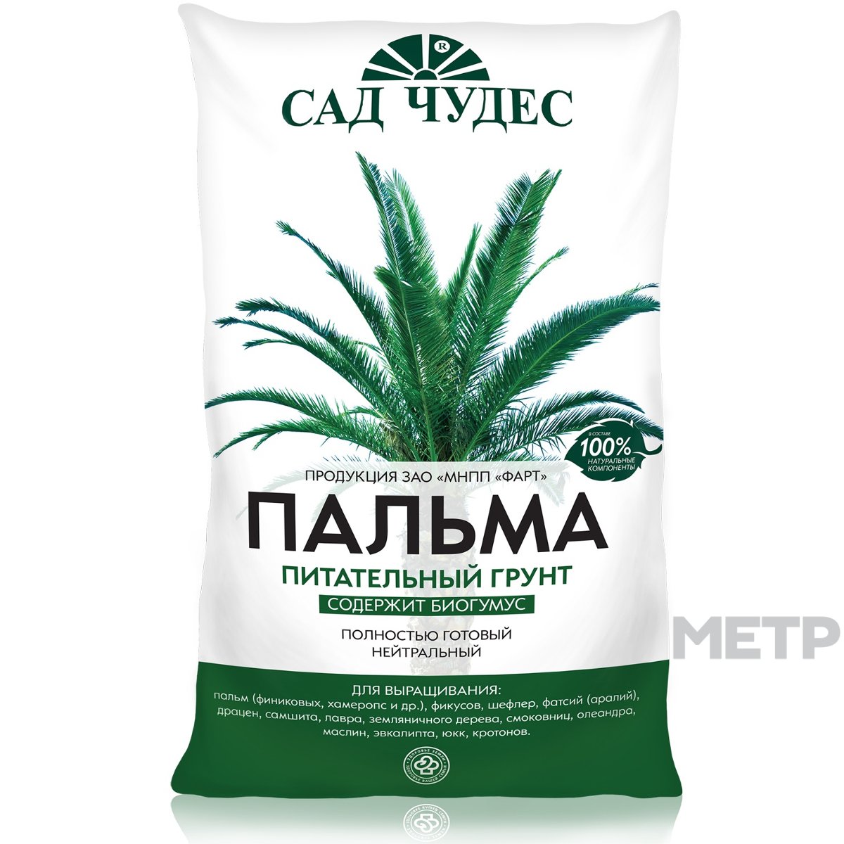 Грунт для пальмы Сад чудес (5 л). Предполагается круглогодичное использование, но правило распространяется на комнатные растения. Смесь из органики и минералов рассчитана на обеспечение лучших условий развития тропическому дереву в помещении (дома, в офисе, торговом центре, гостинице).