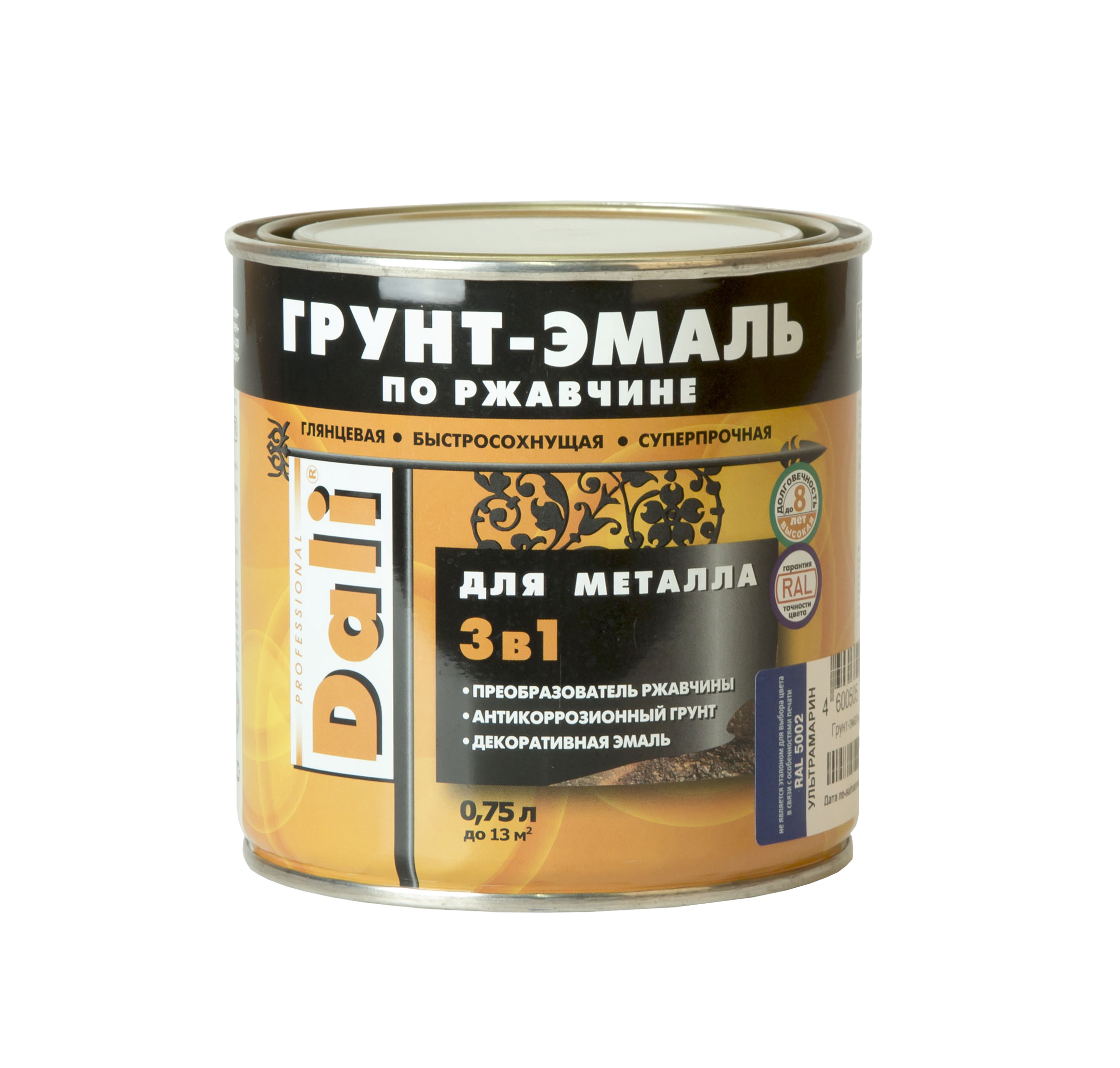 Грунт-эмаль Dali по ржавчине глянцевая желтая 0,75 л, предназначена для защитно-декоративной обработки различных металлических поверхностей, в том числе пораженных точечной или сплошной коррозией c толщиной ржавчины до 100 мкм. Применяется внутри и снаружи помещений по любым металлическим поверхностям, новым и ранее окрашенным. Допускается нанесение на деревянные поверхности, влажностью не выше 20%, эксплуатируемые внутри помещений.