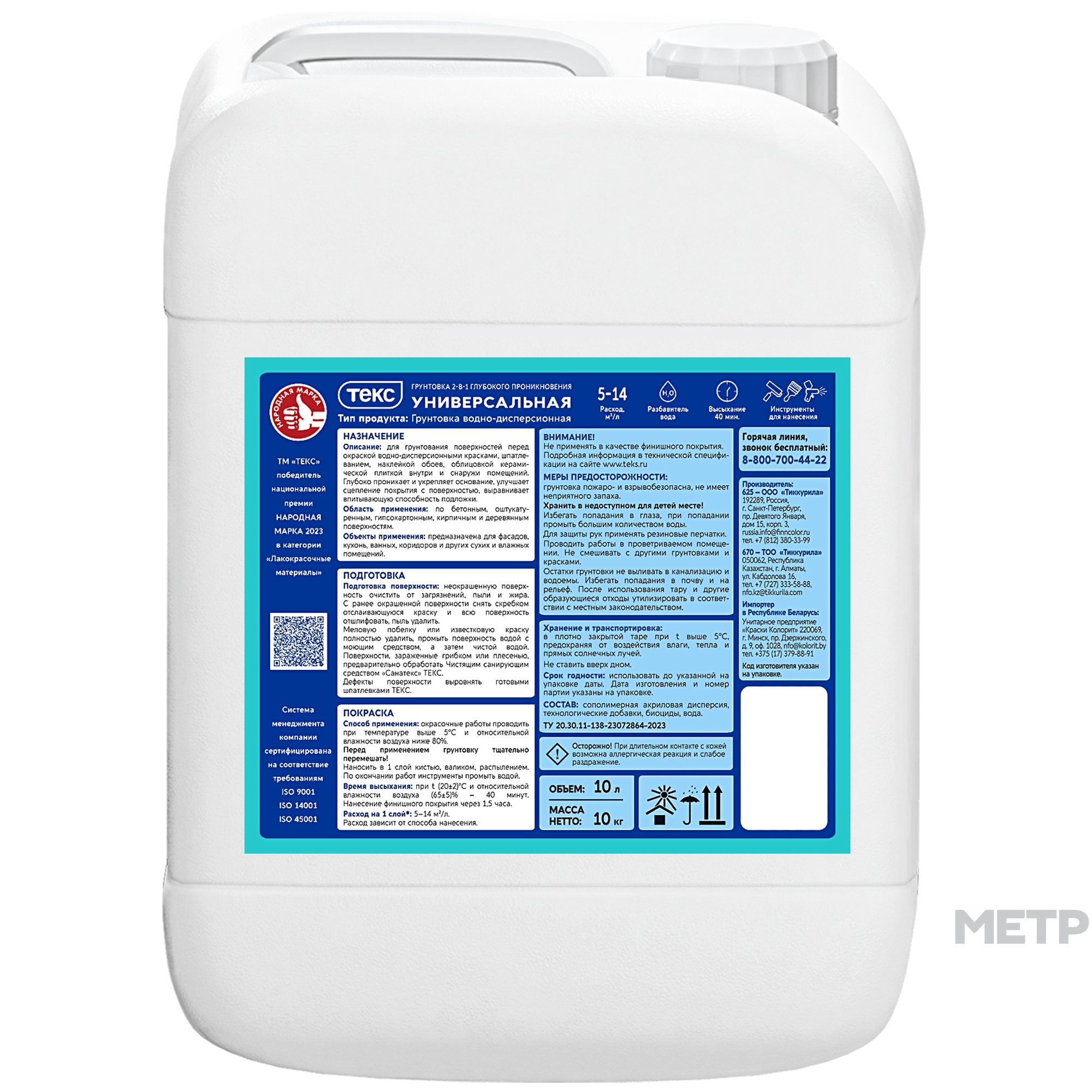 Грунтовка акриловая Универсальная глубокого проникновения 2 в 1 10 кг предназначена для грунтования бетонных, оштукатуренных, гипсокартонных, кирпичных и деревянных поверхностей перед последующей окраской водно-дисперсионными красками, шпатлеванием, облицовкой керамической плиткой и наклейкой обоев внутри сухих помещений и помещений с повышенной влажностью (кухни, ванные, коридоры и др.). Грунтовка глубоко проникает (до 6мм) и укрепляет основание, улучшает сцепление покрытия с поверхностью, выравнивает впитывающую способность подложки.