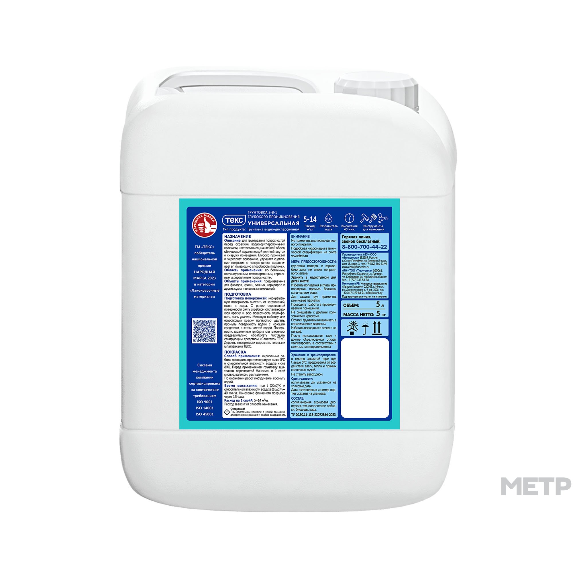 Грунтовка акриловая Универсальная глубокого проникновения 2 в 1 5 кг предназначена для грунтования бетонных, оштукатуренных, гипсокартонных, кирпичных и деревянных поверхностей перед последующей окраской водно-дисперсионными красками, шпатлеванием, облицовкой керамической плиткой и наклейкой обоев внутри сухих помещений и помещений с повышенной влажностью (кухни, ванные, коридоры и др.). Грунтовка глубоко проникает (до 6мм) и укрепляет основание, улучшает сцепление покрытия с поверхностью, выравнивает впитывающую способность подложки.