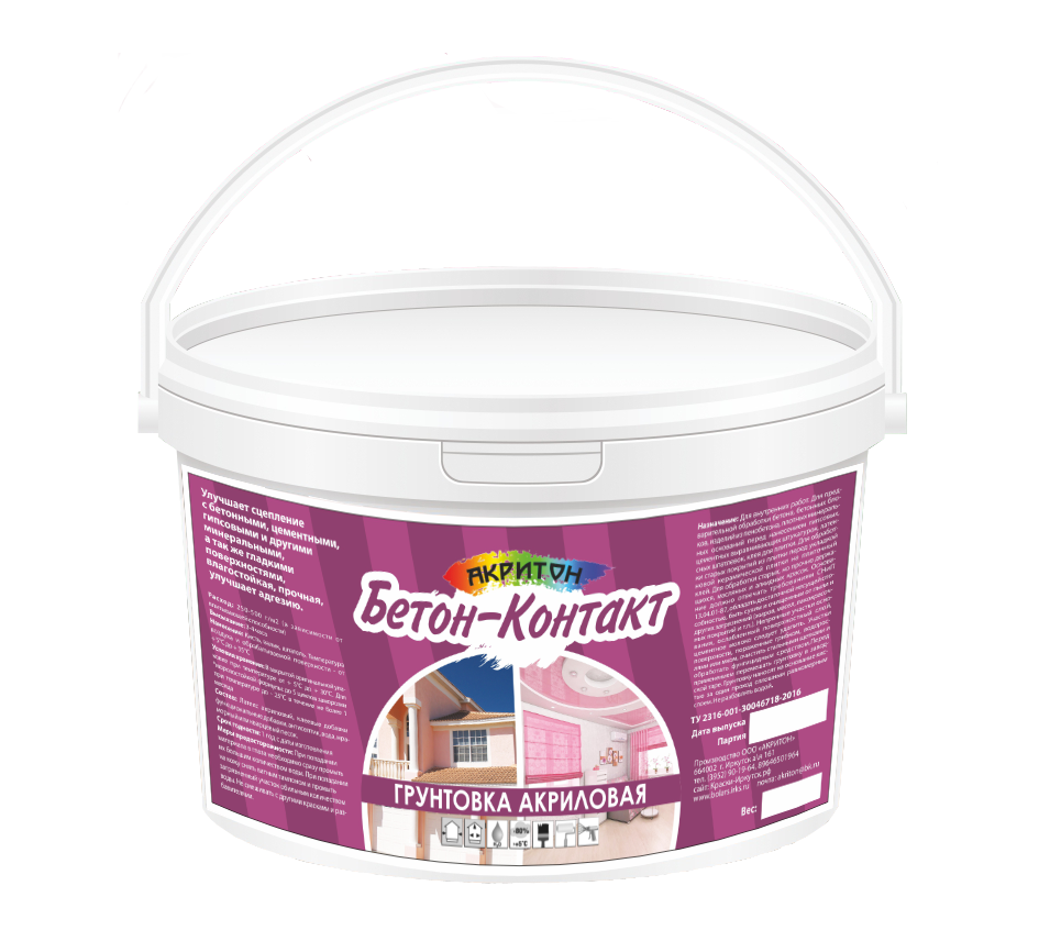 Грунтовка ВД Бетон-контакт Акритон 3 кг улучшает сцепление с бетонными, цементными, гипсовыми и другими минеральными, а также гладкими поверхностями, влагостойкая, прочная, улучшает адгезию.