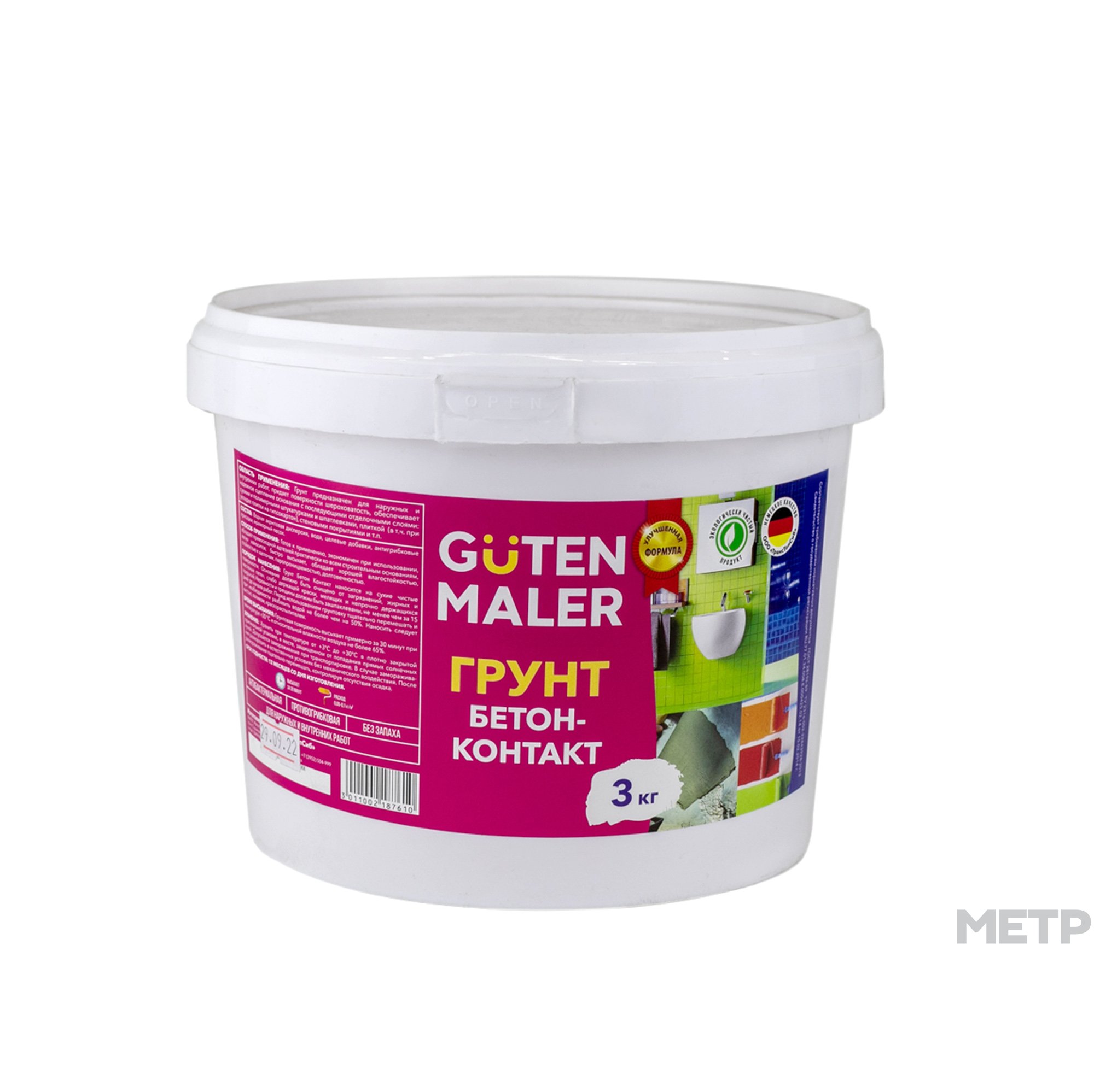 Грунтовка Бетон-контакт Guten Maler 3 кг предназначена для предварительной обработки плотных, слабо впитывающих влагу оснований: монолитного бетона, бетонных блоков, бетонных плит, кирпича, цементных изделий, известковых материалов как внутри, так и снаружи помещений. Возможно использование в качестве сцепляющей грунтовки перед укладкой облицовочной плитки. Высококачественная грунтовка на основе сополимерной акриловой дисперсии, образует на поверхности равномерное шероховатое покрытие, за счет чего улучшает сцепление последующих отделочных слоев с поверхностью. Укрепляет основание и увеличивает долговечность покрытия.