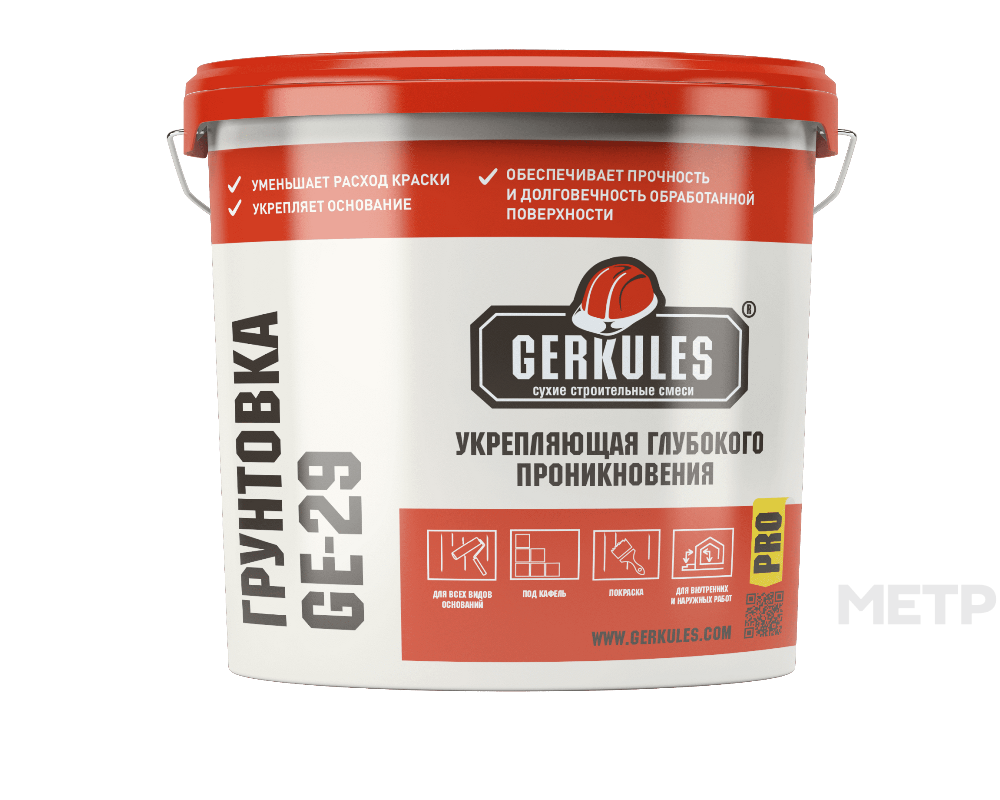 Грунтовка укрепляющая глубокого проникновения GE-29 Геркулес 10 кг предназначена для обработки поверхностей перед нанесением штукатурных и напольных смесей, плиточных клеев и т.д. Применяется для обработки всех видов впитывающих оснований: бетона, цементно-песчаных штукатурок и стяжек, известковых и гипсовых штукатурок, легкого и ячеистого бетона, ангидридных стяжек, кладок из кирпича и природного камня, древесно-стружечных и древесно-волокнистых плит, гипсокартона и т.д.