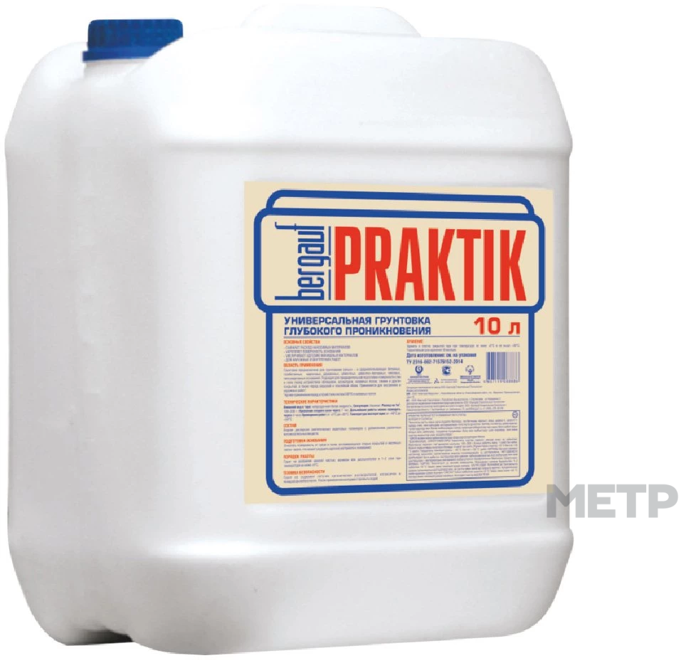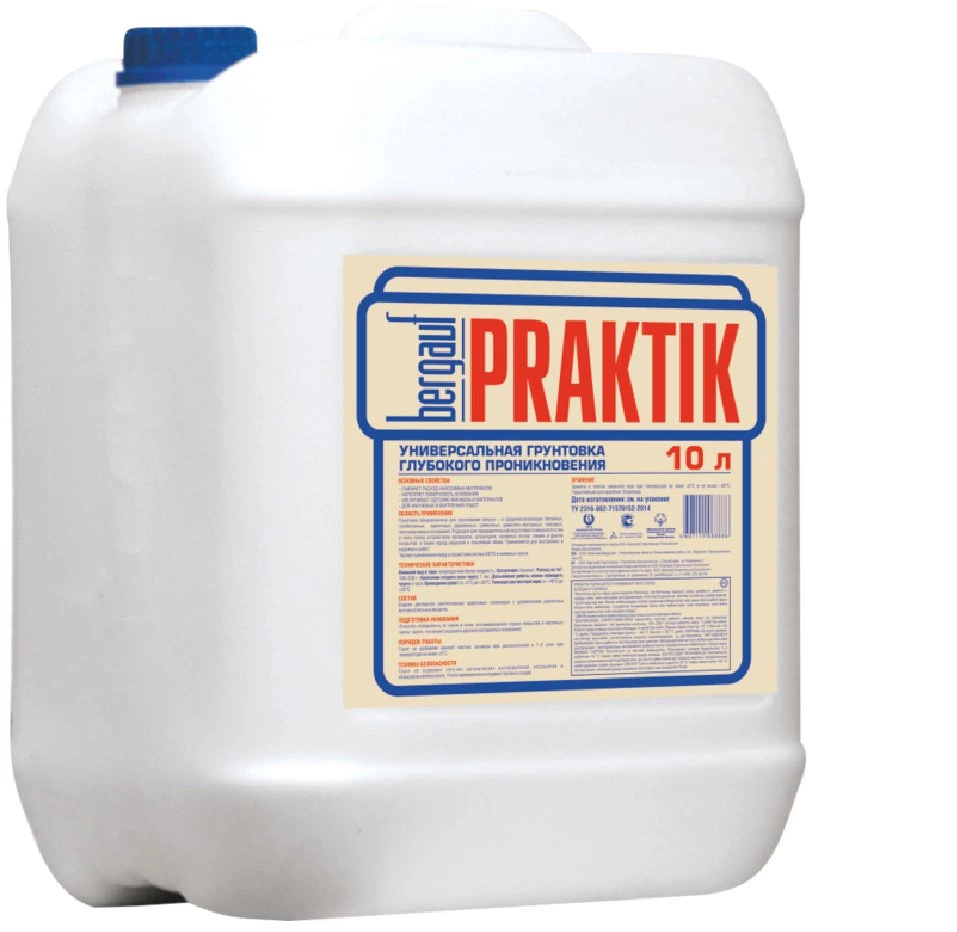 Грунтовка укрепляющая глубокого проникновения Praktik Bergauf 10 л предназначена для грунтования сильно- и средневпитывающих бетонных, газобетонных, кирпичных, деревянных, цементных, цементно-песчанных, гипсовых, гипсокартонных оснований. Подходит для предварительной подготовки поверхности стен и пола перед устройством облицовок, штукатурок, наливных полов, стяжек и других покрытий, а также перед окраской и поклейкой обоев. Применяется для внутренних и наружных работ. Не применяется перед устройством систем СФТК и наливных полов.