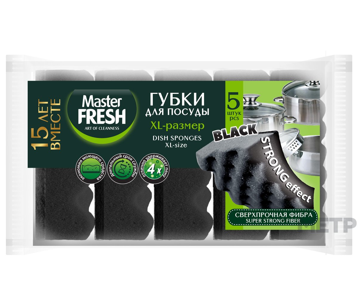 Master FRESH Губки д/мытья посуды STRONG ЧЕРНЫЕ, 5шт имеют СВЕРХПРОЧНУЮ фибру.