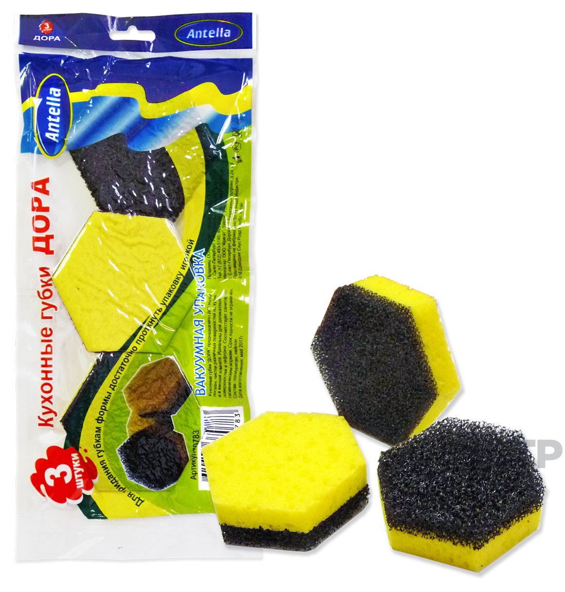 70783 ДОРА губки для посуды в вакуумной упаковке 3шт 9х7,7х3,3см