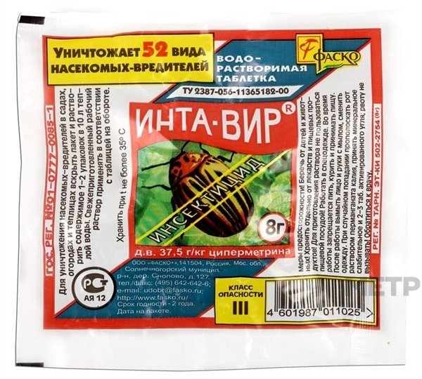 Инсектицид Фаско Инта Вир 8 гр. — принесите на ваш приусадебный участок эту волшебную таблетку и растворите 1-2 упаковки в теплой воде (10 л). Если в саду или огороде поселились 52 вида насекомых-вредителей — универсальный препарат эффективно подействует на всех, независимо от посаженных культур.