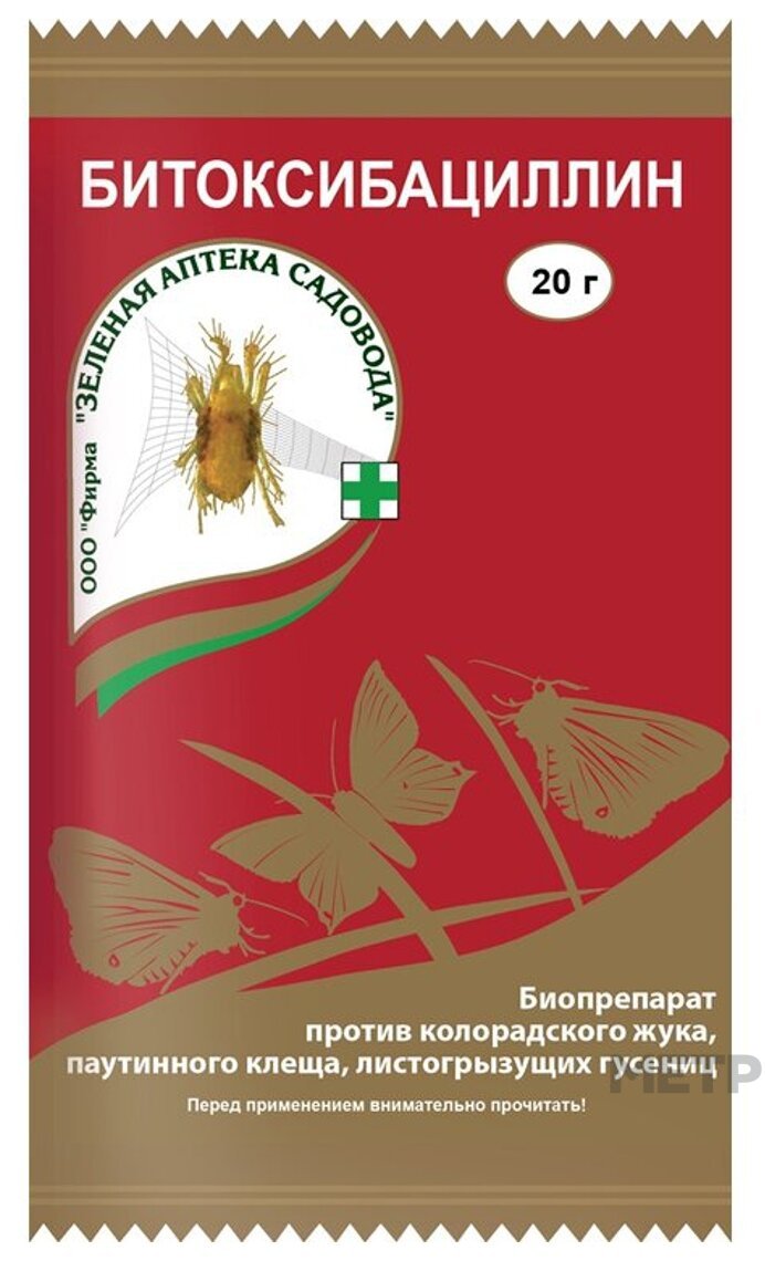 Инсектицид Зеленая аптека садовода Битоксибациллин 20 гр. поможет избавить приусадебный участок от нежеланных гостей. На нем нечего делать колорадскому жуку, паутинному клещу, листовертке, капустной и репной белянке, совке и прочей подобной гадости! Эффективный продукт надежно защитит ваши плоды, овощи и ягодники.