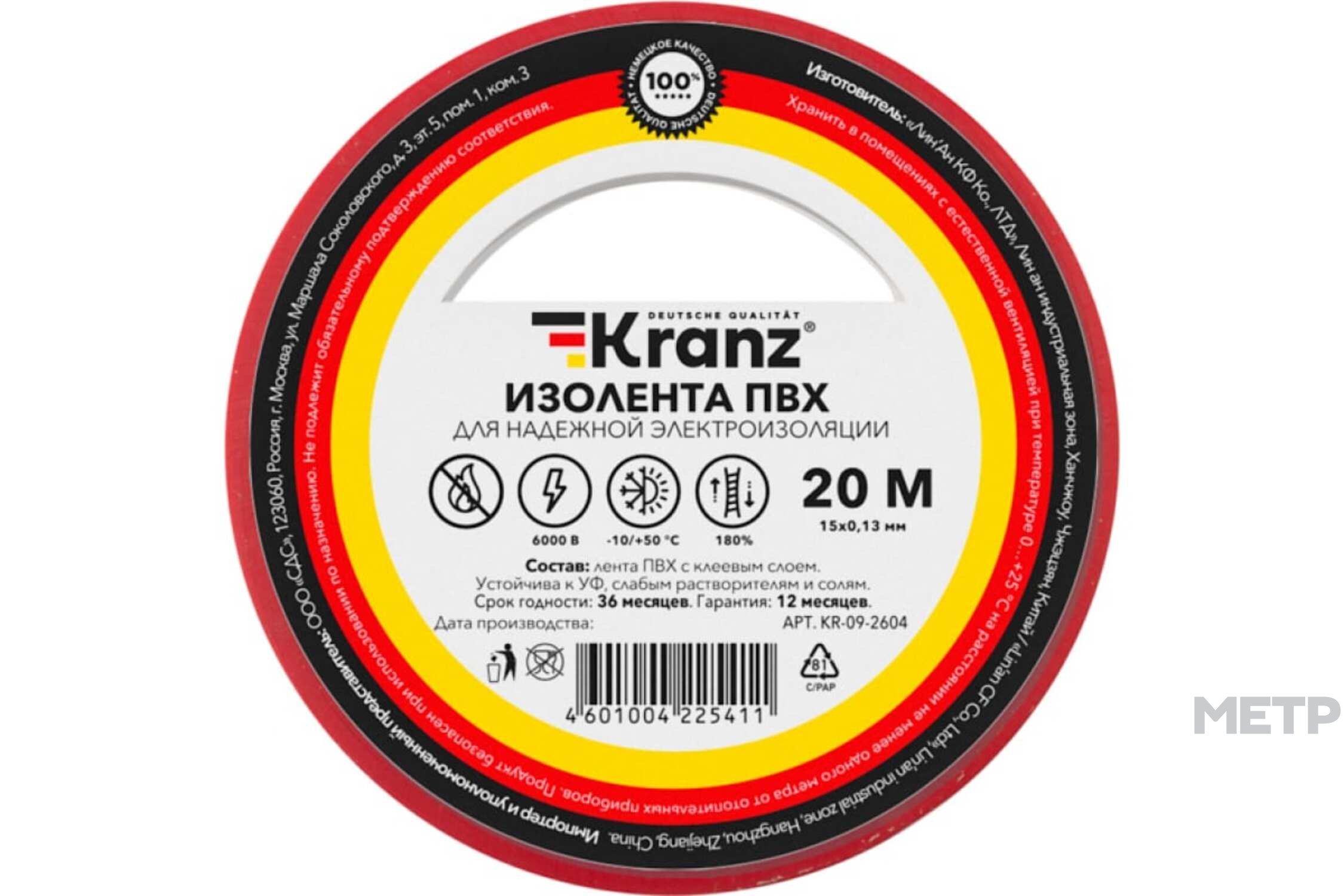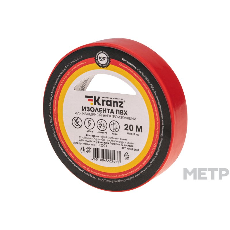 Изолента ПВХ Kranz 15мм х 20м красная с электрической стойкостью 6000 В предназначена для изоляции проводов и кабелей, а также для цветной маркировки. Высококачественное изделие из ПВХ обладает высокой прочностью и допускает использование при температуре от -10 до +50 градусов. Не поддерживает горение. Устойчива к УФ, слабым растворителям и солям.