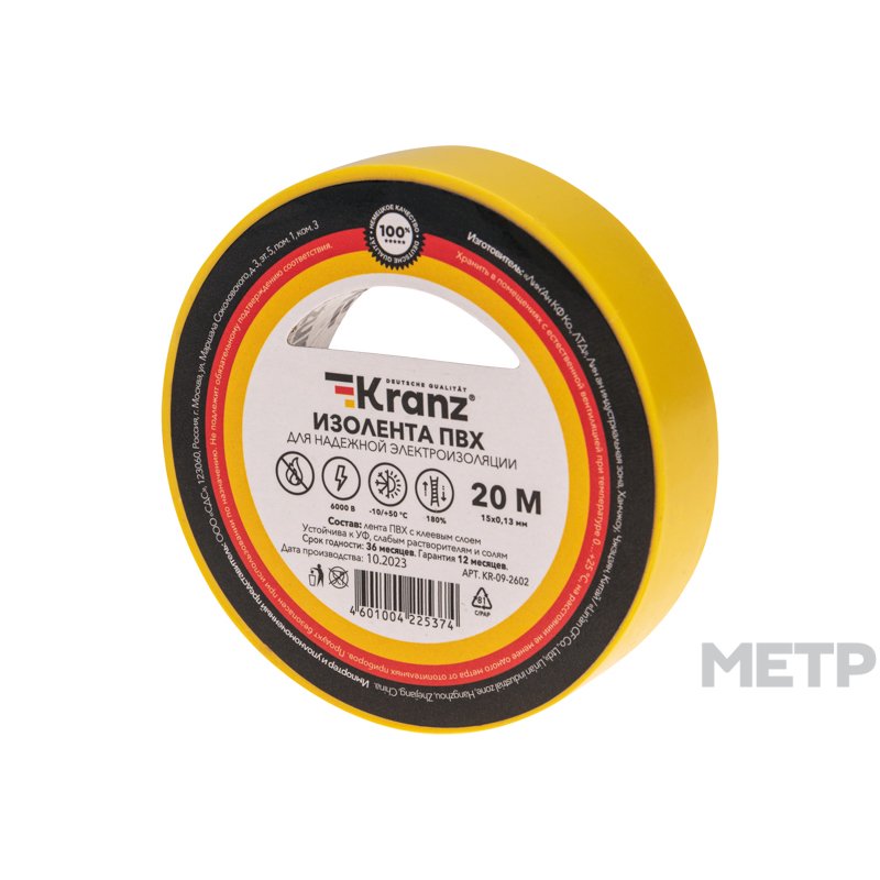 Изолента ПВХ Kranz 15мм х 20м жёлтая изготовлена из материала с электрической стойкостью 6000 В, что позволяет использовать изделие при решении любых задач. При температуре от -10 до +50 градусов ПВХ сможет сохранять свои характеристики продолжительное время. Не поддерживает горение. Устойчива к УФ, слабым растворителям и солям.